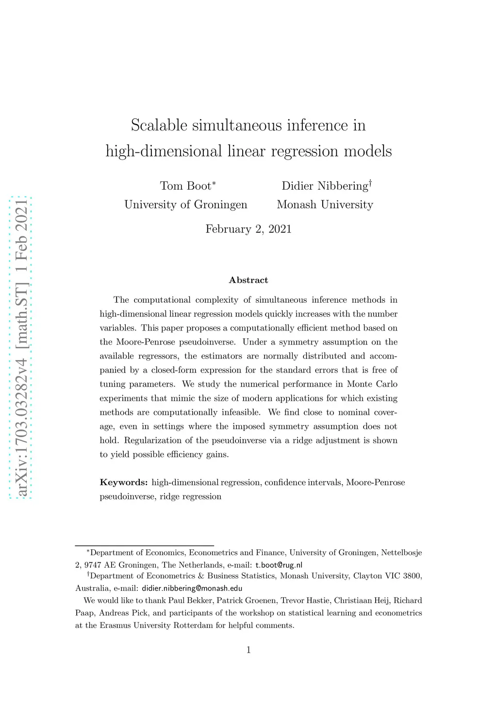 The computational complexity of simultaneous inference methods in high-dimensional linear regression models quickly increases with the number variables. This paper proposes a computationally efficient method based on the Moore-Penrose pseudoinverse. Under a symmetry assumption on the available regressors, the estimators are normally distributed and accompanied by a closed-form expression for the standard errors that is free of tuning parameters. We study the numerical performance in Monte Carlo experiments that mimic the size of modern applications for which existing methods are computationally infeasible. We find close to nominal coverage, even in settings where the imposed symmetry assumption does not hold. Regularization of the pseudoinverse via a ridge adjustment is shown to yield possible efficiency gains.