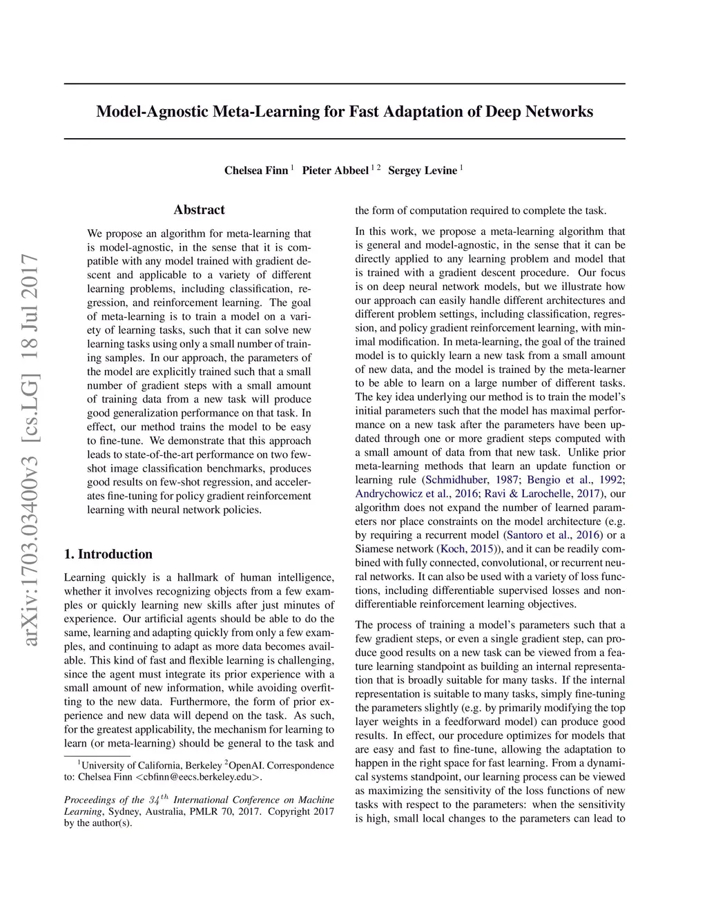 We propose an algorithm for meta-learning that is model-agnostic, in the sense that it is compatible with any model trained with gradient descent and applicable to a variety of different learning problems, including classification, regression, and reinforcement learning. The goal of meta-learning is to train a model on a variety of learning tasks, such that it can solve new learning tasks using only a small number of training samples. In our approach, the parameters of the model are explicitly trained such that a small number of gradient steps with a small amount of training data from a new task will produce good generalization performance on that task. In effect, our method trains the model to be easy to fine-tune. We demonstrate that this approach leads to state-of-the-art performance on two few-shot image classification benchmarks, produces good results on few-shot regression, and accelerates fine-tuning for policy gradient reinforcement learning with neural network policies.