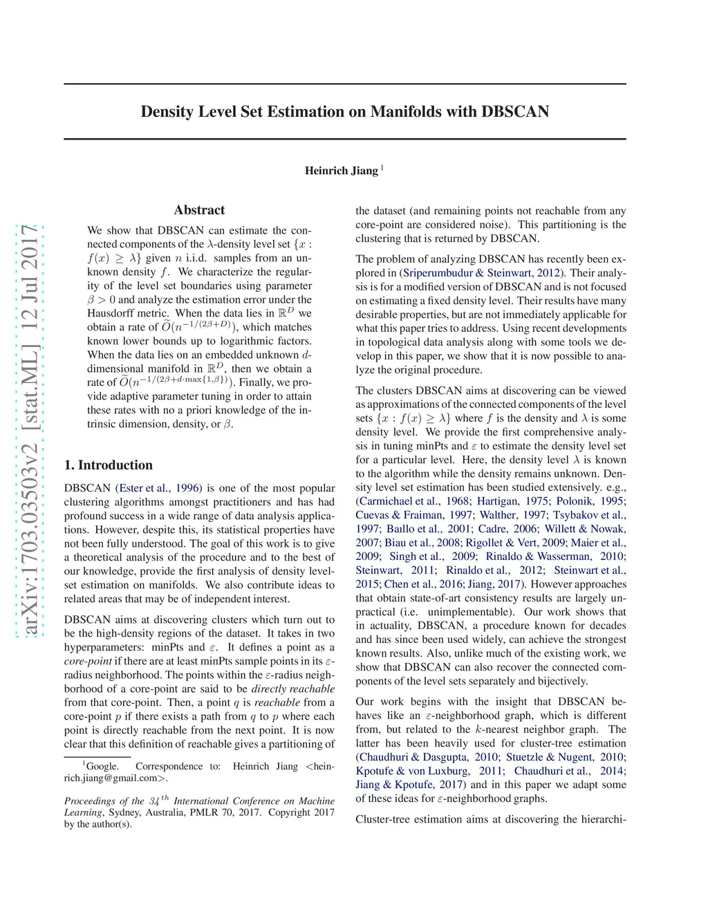 DBSCAN is one of the most popular clustering algorithms amongst practitioners, but it has received comparatively less theoretical treatment. We show that given and its parameters set under appropriate ranges, DBSCAN estimates the connected components of the -density level set (i.e. where is the density). We characterize the regularity of the level set boundaries using parameter and analyze the estimation error under the Hausdorff metric. When the data lies in we obtain an estimation rate of , which matches known lower bounds up to logarithmic factors. When the data lies on an embedded unknown -dimensional manifold in , then we obtain an estimation rate of . Finally, we provide adaptive parameter tuning in order to attain these rates with no a priori knowledge of the intrinsic dimension, density, or .