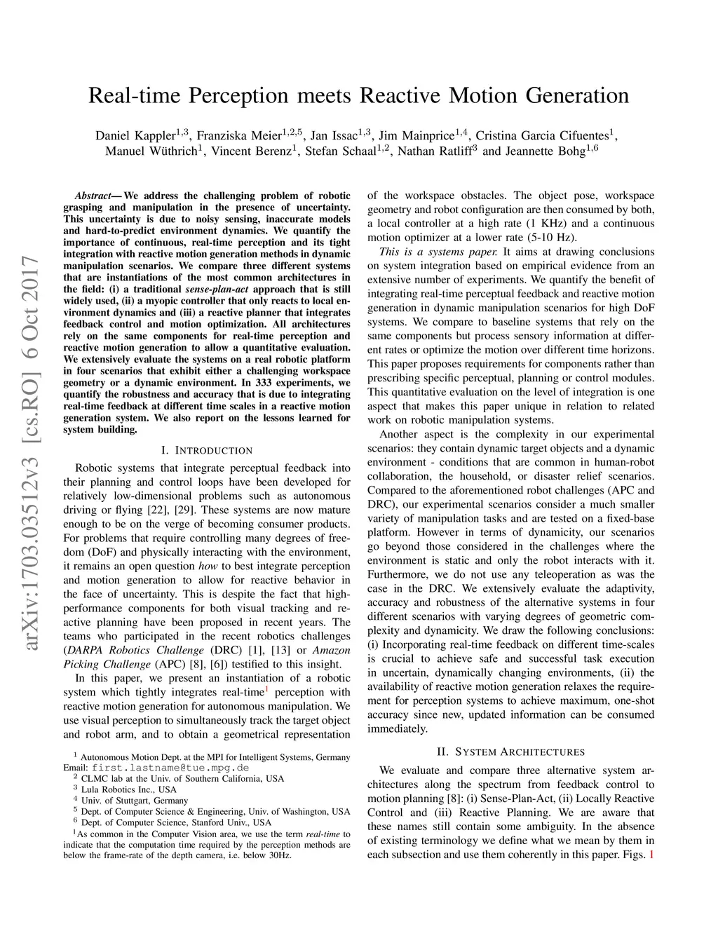 We address the challenging problem of robotic grasping and manipulation in the presence of uncertainty. This uncertainty is due to noisy sensing, inaccurate models and hard-to-predict environment dynamics. Our approach emphasizes the importance of continuous, real-time perception and its tight integration with reactive motion generation methods. We present a fully integrated system where real-time object and robot tracking as well as ambient world modeling provides the necessary input to feedback controllers and continuous motion optimizers. Specifically, they provide attractive and repulsive potentials based on which the controllers and motion optimizer can online compute movement policies over different time horizons. We extensively evaluate the proposed system on a real robotic platform in four scenarios that exhibit either challenging workspace geometry or a dynamic environment. We compare the proposed integrated system with a more traditional sense-plan-act approach that is still widely used and to a myopic controller that only reacts to local environment dynamics. In 333 experiments, we show the robustness and accuracy of the proposed system as compared to alternative system architectures.
