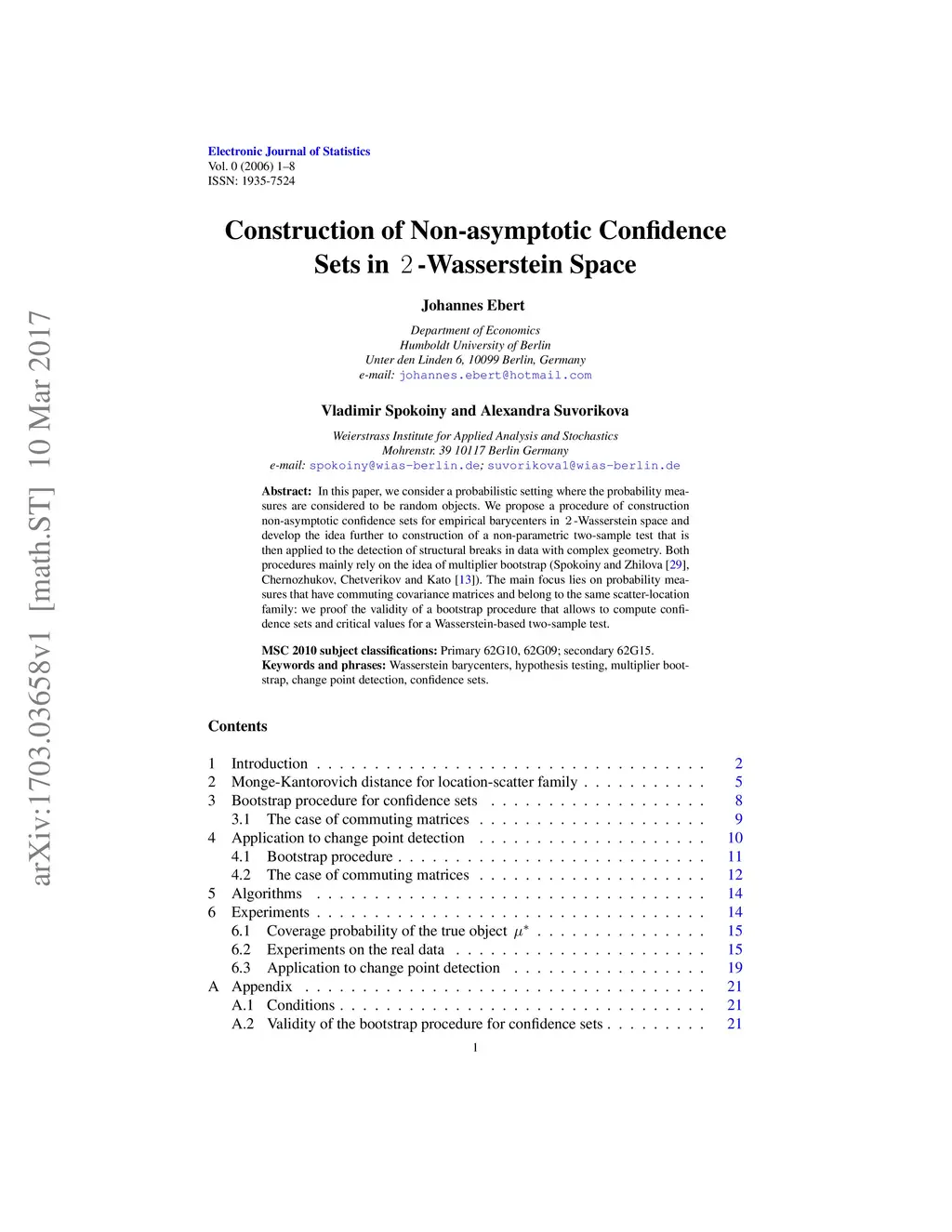 In this paper, we consider a probabilistic setting where the probability measures are considered to be random objects. We propose a procedure of construction non-asymptotic confidence sets for empirical barycenters in 2-Wasserstein space and develop the idea further to construction of a non-parametric two-sample test that is then applied to the detection of structural breaks in data with complex geometry. Both procedures mainly rely on the idea of multiplier bootstrap (Spokoiny and Zhilova (2015), Chernozhukov et al. (2014)). The main focus lies on probability measures that have commuting covariance matrices and belong to the same scatter-location family: we proof the validity of a bootstrap procedure that allows to compute confidence sets and critical values for a Wasserstein-based two-sample test.