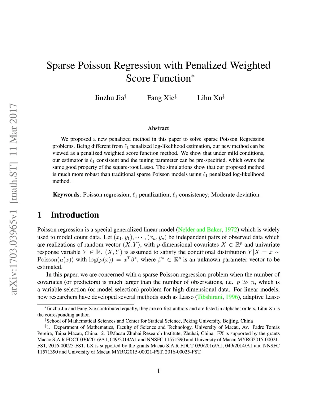 Sparse Poisson Regression with Penalized Weighted Score Function
