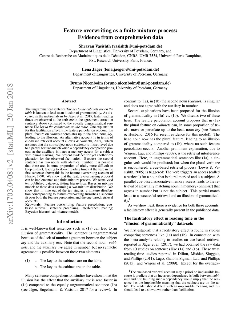 The ungrammatical sentence "The key to the cabinets are on the table" is known to lead to an illusion of grammaticality. As discussed in the meta-analysis by Jaeger et al., 2017, faster reading times are observed at the verb are in the agreement-attraction sentence above compared to the equally ungrammatical sentence "The key to the cabinet are on the table". One explanation for this facilitation effect is the feature percolation account: the plural feature on cabinets percolates up to the head noun key, leading to the illusion. An alternative account is in terms of cue-based retrieval (Lewis & Vasishth, 2005), which assumes that the non-subject noun cabinets is misretrieved due to a partial feature-match when a dependency completion process at the auxiliary initiates a memory access for a subject with plural marking. We present evidence for yet another explanation for the observed facilitation. Because the second sentence has two nouns with identical number, it is possible that these are, in some proportion of trials, more difficult to keep distinct, leading to slower reading times at the verb in the first sentence above; this is the feature overwriting account of Nairne, 1990. We show that the feature overwriting proposal can be implemented as a finite mixture process. We reanalysed ten published data-sets, fitting hierarchical Bayesian mixture models to these data assuming a two-mixture distribution. We show that in nine out of the ten studies, a mixture distribution corresponding to feature overwriting furnishes a superior fit over both the feature percolation and the cue-based retrieval accounts.