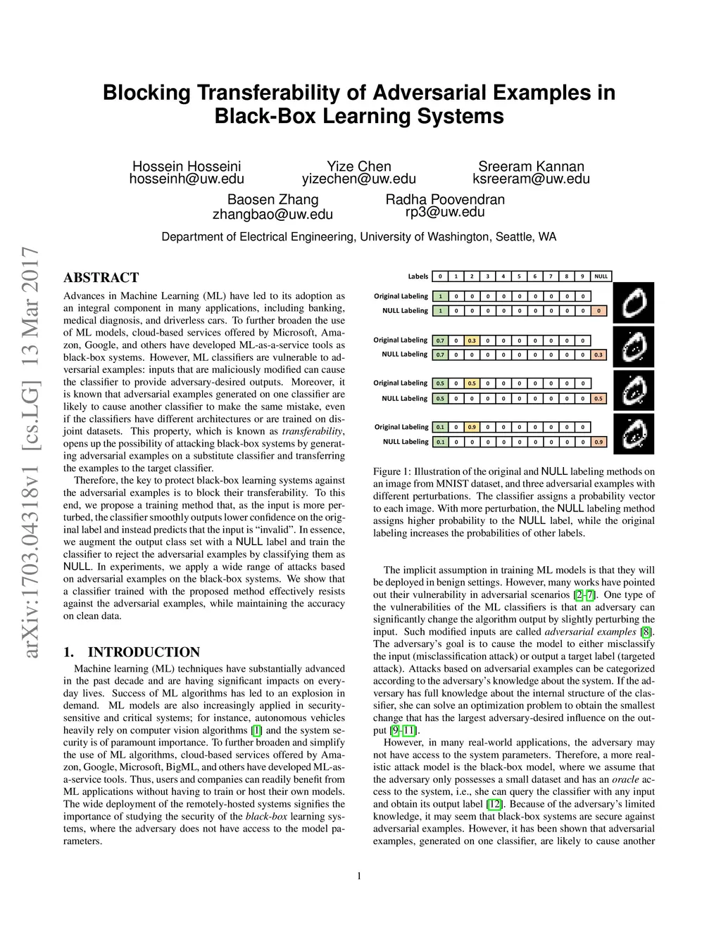 Advances in Machine Learning (ML) have led to its adoption as an integral component in many applications, including banking, medical diagnosis, and driverless cars. To further broaden the use of ML models, cloud-based services offered by Microsoft, Amazon, Google, and others have developed ML-as-a-service tools as black-box systems. However, ML classifiers are vulnerable to adversarial examples: inputs that are maliciously modified can cause the classifier to provide adversary-desired outputs. Moreover, it is known that adversarial examples generated on one classifier are likely to cause another classifier to make the same mistake, even if the classifiers have different architectures or are trained on disjoint datasets. This property, which is known as transferability, opens up the possibility of attacking black-box systems by generating adversarial examples on a substitute classifier and transferring the examples to the target classifier. Therefore, the key to protect black-box learning systems against the adversarial examples is to block their transferability. To this end, we propose a training method that, as the input is more perturbed, the classifier smoothly outputs lower confidence on the original label and instead predicts that the input is "invalid". In essence, we augment the output class set with a NULL label and train the classifier to reject the adversarial examples by classifying them as NULL. In experiments, we apply a wide range of attacks based on adversarial examples on the black-box systems. We show that a classifier trained with the proposed method effectively resists against the adversarial examples, while maintaining the accuracy on clean data.