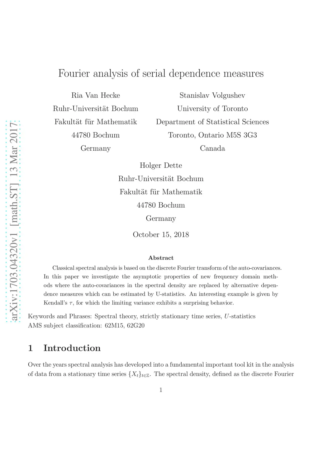 Classical spectral analysis is based on the discrete Fourier transform of the auto-covariances. In this paper we investigate the asymptotic properties of new frequency domain methods where the auto-covariances in the spectral density are replaced by alternative dependence measures which can be estimated by U-statistics. An interesting example is given by Kendall{'}s , for which the limiting variance exhibits a surprising behavior.