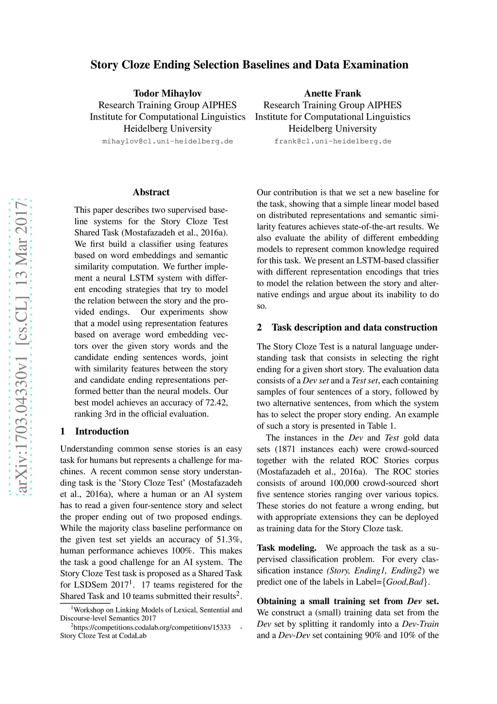 This paper describes two supervised baseline systems for the Story Cloze Test Shared Task (Mostafazadeh et al., 2016a). We first build a classifier using features based on word embeddings and semantic similarity computation. We further implement a neural LSTM system with different encoding strategies that try to model the relation between the story and the provided endings. Our experiments show that a model using representation features based on average word embedding vectors over the given story words and the candidate ending sentences words, joint with similarity features between the story and candidate ending representations performed better than the neural models. Our best model achieves an accuracy of 72.42, ranking 3rd in the official evaluation.