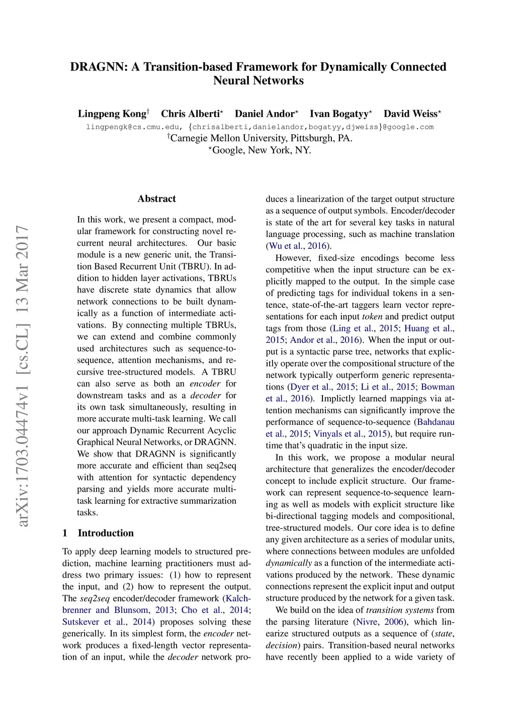 DRAGNN: A Transition-based Framework for Dynamically Connected Neural