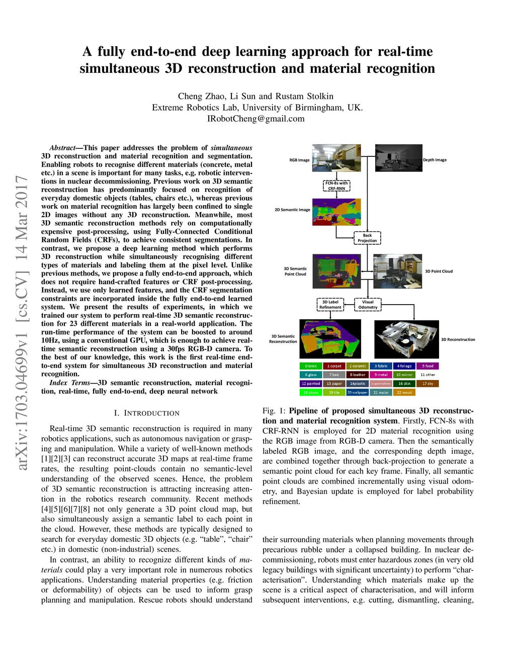 This paper addresses the problem of simultaneous 3D reconstruction and material recognition and segmentation. Enabling robots to recognise different materials (concrete, metal etc.) in a scene is important for many tasks, e.g. robotic interventions in nuclear decommissioning. Previous work on 3D semantic reconstruction has predominantly focused on recognition of everyday domestic objects (tables, chairs etc.), whereas previous work on material recognition has largely been confined to single 2D images without any 3D reconstruction. Meanwhile, most 3D semantic reconstruction methods rely on computationally expensive post-processing, using Fully-Connected Conditional Random Fields (CRFs), to achieve consistent segmentations. In contrast, we propose a deep learning method which performs 3D reconstruction while simultaneously recognising different types of materials and labelling them at the pixel level. Unlike previous methods, we propose a fully end-to-end approach, which does not require hand-crafted features or CRF post-processing. Instead, we use only learned features, and the CRF segmentation constraints are incorporated inside the fully end-to-end learned system. We present the results of experiments, in which we trained our system to perform real-time 3D semantic reconstruction for 23 different materials in a real-world application. The run-time performance of the system can be boosted to around 10Hz, using a conventional GPU, which is enough to achieve real-time semantic reconstruction using a 30fps RGB-D camera. To the best of our knowledge, this work is the first real-time end-to-end system for simultaneous 3D reconstruction and material recognition.