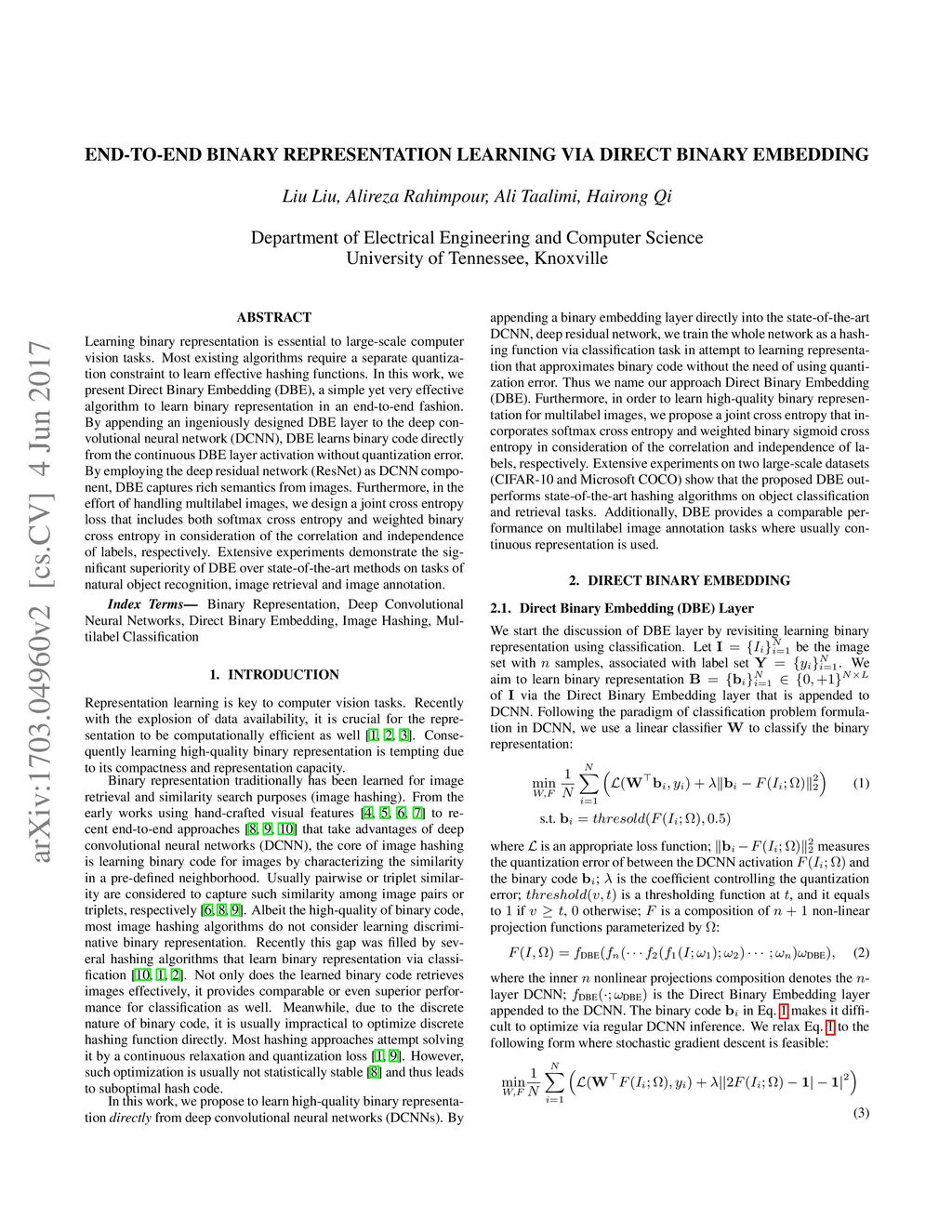 Learning binary representation is essential to large-scale computer vision tasks. Most existing algorithms require a separate quantization constraint to learn effective hashing functions. In this work, we present Direct Binary Embedding (DBE), a simple yet very effective algorithm to learn binary representation in an end-to-end fashion. By appending an ingeniously designed DBE layer to the deep convolutional neural network (DCNN), DBE learns binary code directly from the continuous DBE layer activation without quantization error. By employing the deep residual network (ResNet) as DCNN component, DBE captures rich semantics from images. Furthermore, in the effort of handling multilabel images, we design a joint cross entropy loss that includes both softmax cross entropy and weighted binary cross entropy in consideration of the correlation and independence of labels, respectively. Extensive experiments demonstrate the significant superiority of DBE over state-of-the-art methods on tasks of natural object recognition, image retrieval and image annotation.
