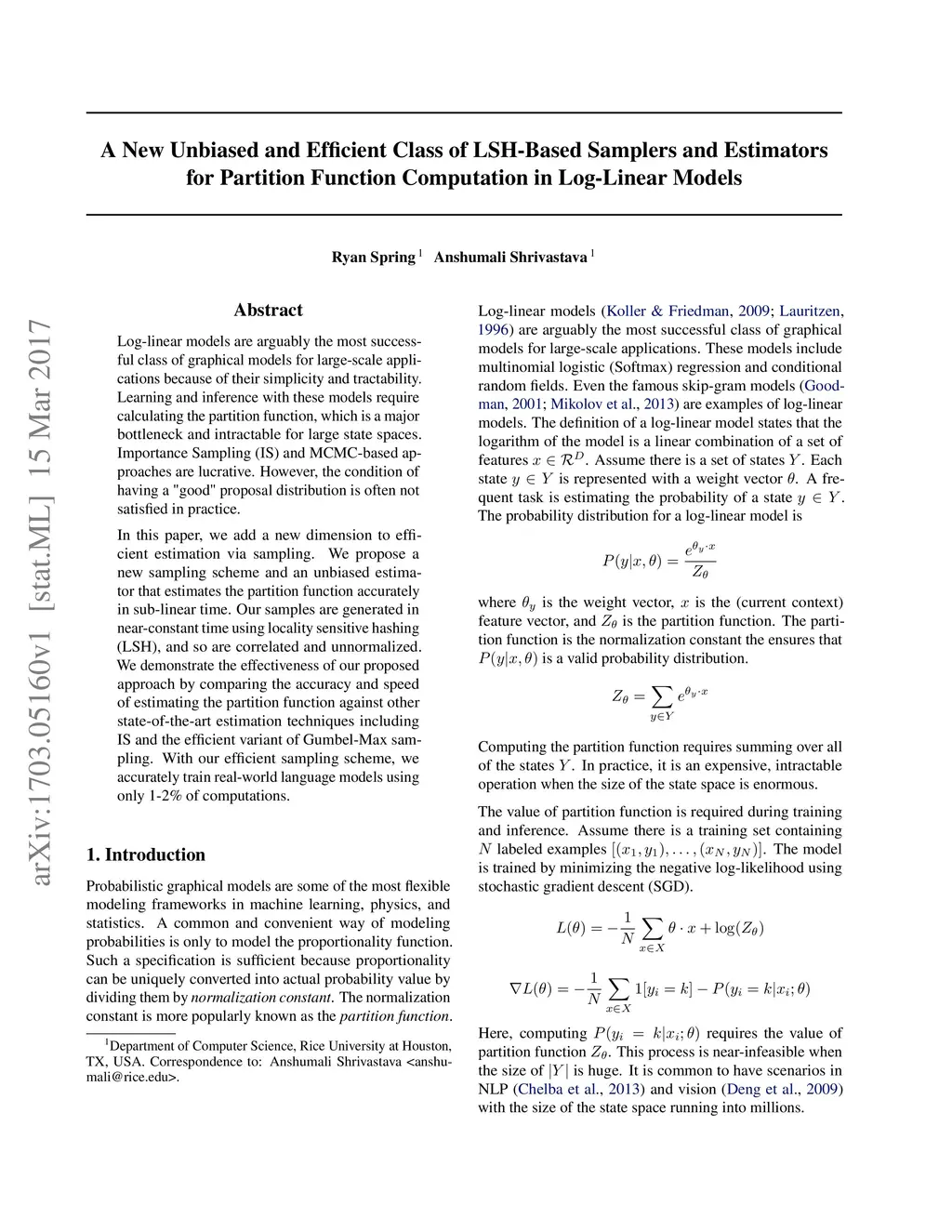Log-linear models are arguably the most successful class of graphical models for large-scale applications because of their simplicity and tractability. Learning and inference with these models require calculating the partition function, which is a major bottleneck and intractable for large state spaces. Importance Sampling (IS) and MCMC-based approaches are lucrative. However, the condition of having a "good" proposal distribution is often not satisfied in practice. In this paper, we add a new dimension to efficient estimation via sampling. We propose a new sampling scheme and an unbiased estimator that estimates the partition function accurately in sub-linear time. Our samples are generated in near-constant time using locality sensitive hashing (LSH), and so are correlated and unnormalized. We demonstrate the effectiveness of our proposed approach by comparing the accuracy and speed of estimating the partition function against other state-of-the-art estimation techniques including IS and the efficient variant of Gumbel-Max sampling. With our efficient sampling scheme, we accurately train real-world language models using only 1-2% of computations.