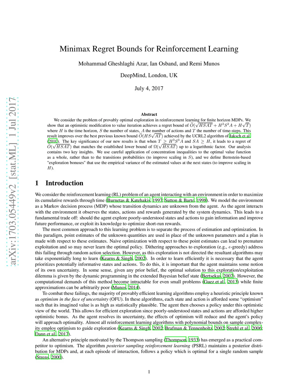 We consider the problem of provably optimal exploration in reinforcement learning for finite horizon MDPs. We show that an optimistic modification to value iteration achieves a regret bound of where is the time horizon, the number of states, the number of actions and the number of time-steps. This result improves over the best previous known bound achieved by the UCRL2 algorithm of Jaksch et al., 2010. The key significance of our new results is that when and , it leads to a regret of that matches the established lower bound of up to a logarithmic factor. Our analysis contains two key insights. We use careful application of concentration inequalities to the optimal value function as a whole, rather than to the transitions probabilities (to improve scaling in ), and we define Bernstein-based "exploration bonuses" that use the empirical variance of the estimated values at the next states (to improve scaling in ).