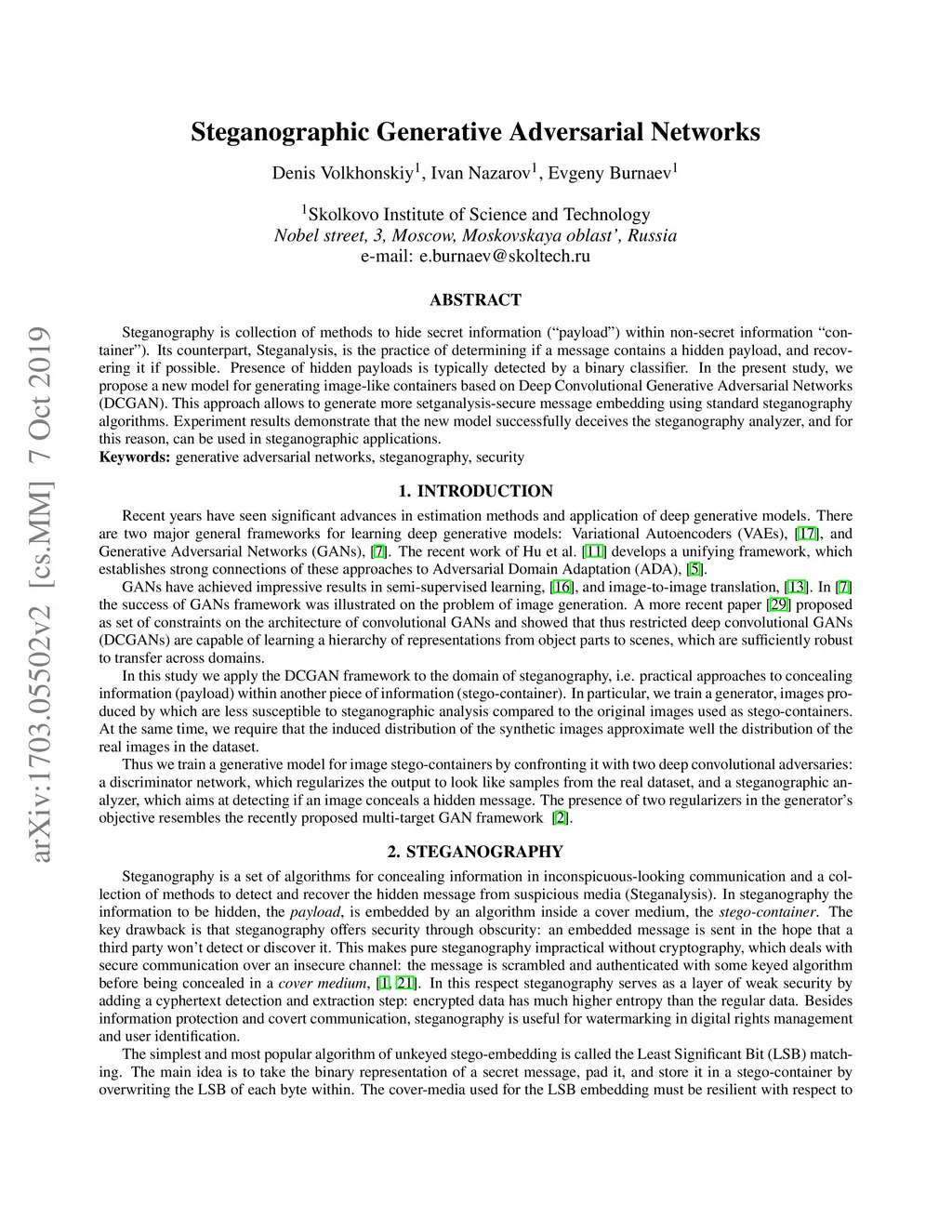 Steganography is collection of methods to hide secret information ("payload") within non-secret information "container"). Its counterpart, Steganalysis, is the practice of determining if a message contains a hidden payload, and recovering it if possible. Presence of hidden payloads is typically detected by a binary classifier. In the present study, we propose a new model for generating image-like containers based on Deep Convolutional Generative Adversarial Networks (DCGAN). This approach allows to generate more setganalysis-secure message embedding using standard steganography algorithms. Experiment results demonstrate that the new model successfully deceives the steganography analyzer, and for this reason, can be used in steganographic applications.