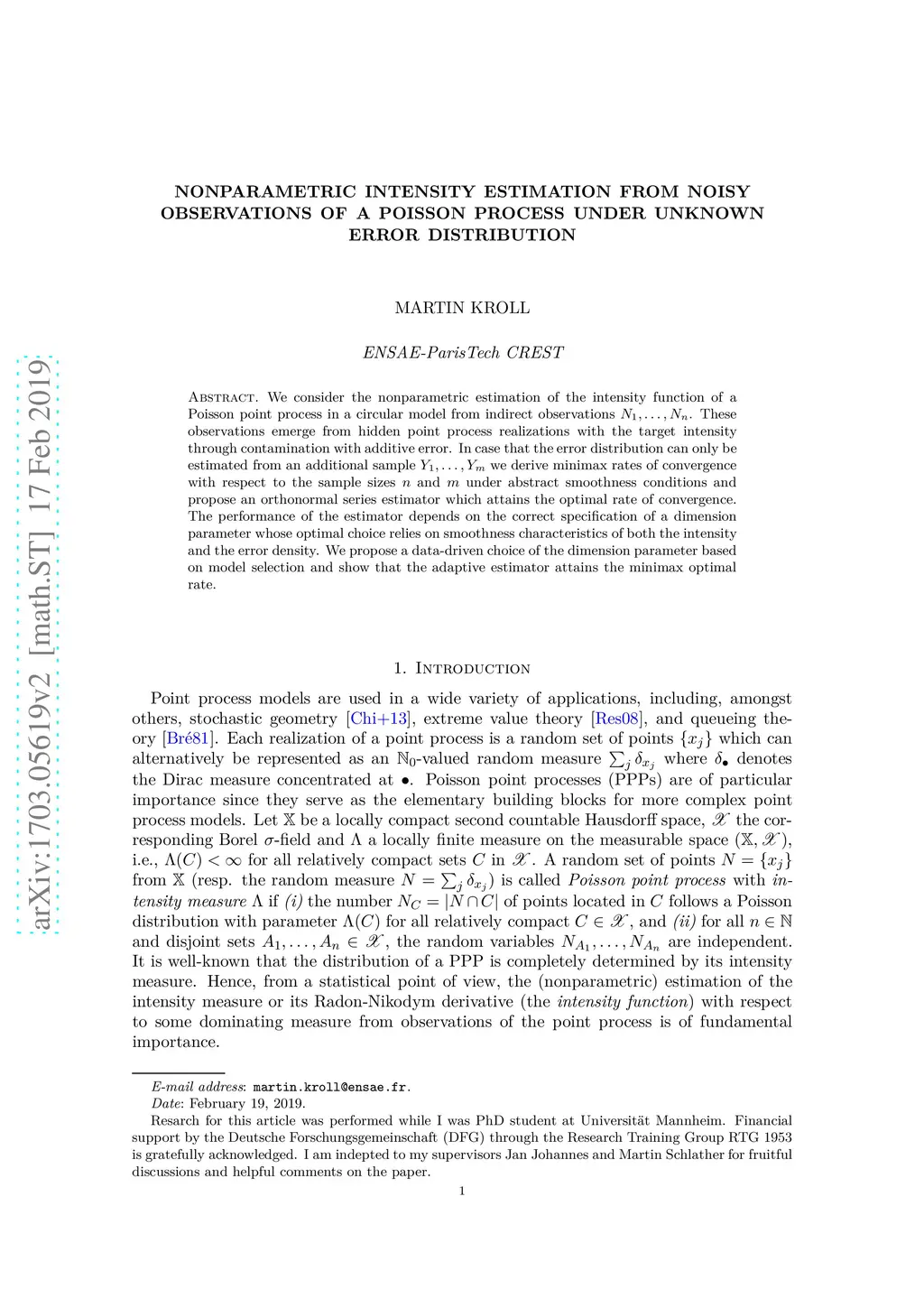 We consider the nonparametric estimation of the intensity function of a Poisson point process in a circular model from indirect observations . These observations emerge from hidden point process realizations with the target intensity through contamination with additive error. Under the assumption that the error distribution is unknown and only available by means of an additional sample we derive minimax rates of convergence with respect to the sample sizes and under abstract smoothness conditions and propose an orthonormal series estimator which attains the optimal rate of convergence. The performance of the estimator depends on the correct specification of a dimension parameter whose optimal choice relies on smoothness characteristics of both the intensity and the error density. Since a priori knowledge of such characteristics is a too strong assumption, we propose a data-driven choice of the dimension parameter based on model selection and show that the adaptive estimator either attains the minimax optimal rate or is suboptimal only by a logarithmic factor.