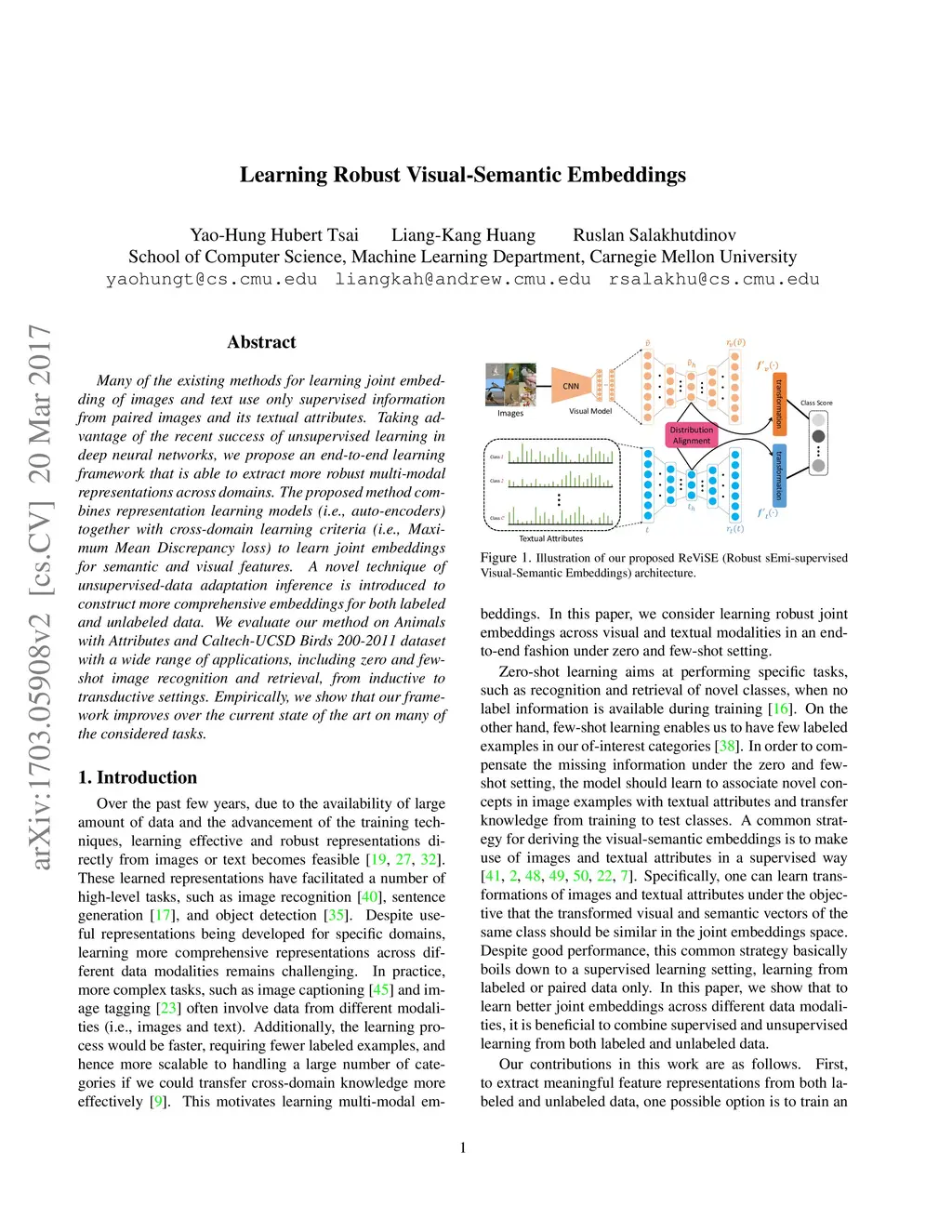 Many of the existing methods for learning joint embedding of images and text use only supervised information from paired images and its textual attributes. Taking advantage of the recent success of unsupervised learning in deep neural networks, we propose an end-to-end learning framework that is able to extract more robust multi-modal representations across domains. The proposed method combines representation learning models (i.e., auto-encoders) together with cross-domain learning criteria (i.e., Maximum Mean Discrepancy loss) to learn joint embeddings for semantic and visual features. A novel technique of unsupervised-data adaptation inference is introduced to construct more comprehensive embeddings for both labeled and unlabeled data. We evaluate our method on Animals with Attributes and Caltech-UCSD Birds 200-2011 dataset with a wide range of applications, including zero and few-shot image recognition and retrieval, from inductive to transductive settings. Empirically, we show that our framework improves over the current state of the art on many of the considered tasks.