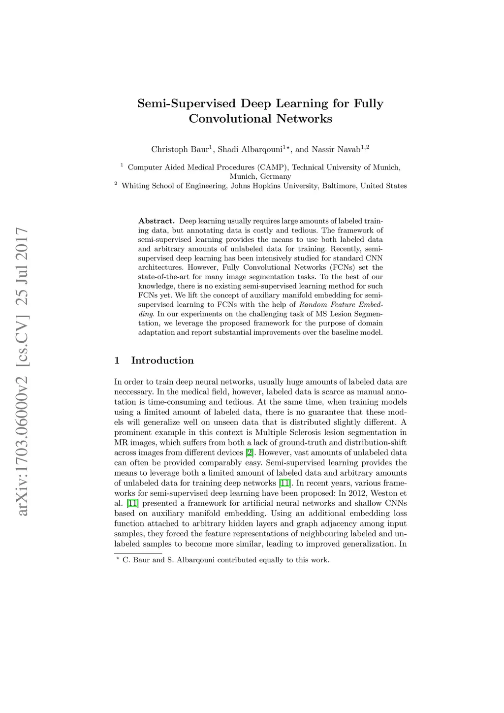 Deep learning usually requires large amounts of labeled training data, but annotating data is costly and tedious. The framework of semi-supervised learning provides the means to use both labeled data and arbitrary amounts of unlabeled data for training. Recently, semi-supervised deep learning has been intensively studied for standard CNN architectures. However, Fully Convolutional Networks (FCNs) set the state-of-the-art for many image segmentation tasks. To the best of our knowledge, there is no existing semi-supervised learning method for such FCNs yet. We lift the concept of auxiliary manifold embedding for semi-supervised learning to FCNs with the help of Random Feature Embedding. In our experiments on the challenging task of MS Lesion Segmentation, we leverage the proposed framework for the purpose of domain adaptation and report substantial improvements over the baseline model.