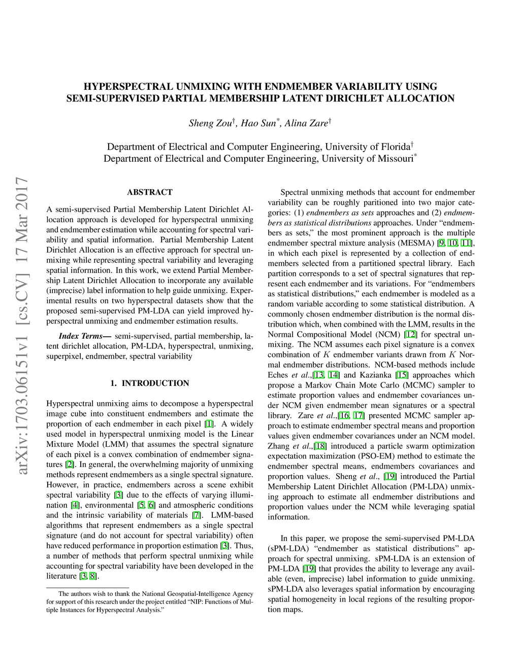 A semi-supervised Partial Membership Latent Dirichlet Allocation approach is developed for hyperspectral unmixing and endmember estimation while accounting for spectral variability and spatial information. Partial Membership Latent Dirichlet Allocation is an effective approach for spectral unmixing while representing spectral variability and leveraging spatial information. In this work, we extend Partial Membership Latent Dirichlet Allocation to incorporate any available (imprecise) label information to help guide unmixing. Experimental results on two hyperspectral datasets show that the proposed semi-supervised PM-LDA can yield improved hyperspectral unmixing and endmember estimation results.