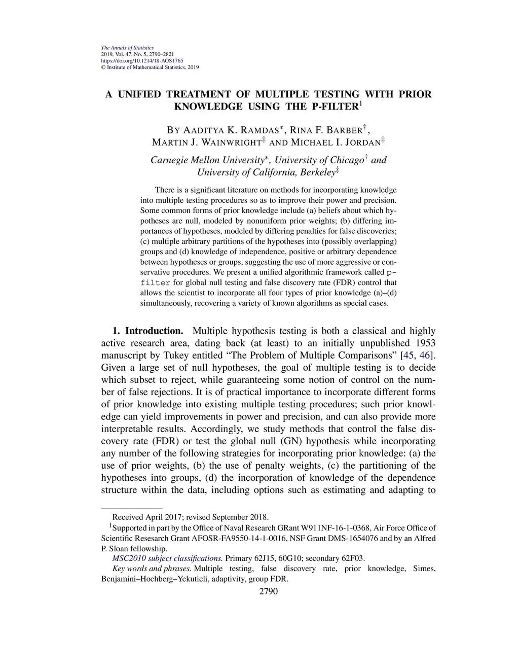 There is a significant literature on methods for incorporating knowledge into multiple testing procedures so as to improve their power and precision. Some common forms of prior knowledge include (a) beliefs about which hypotheses are null, modeled by non-uniform prior weights; (b) differing importances of hypotheses, modeled by differing penalties for false discoveries; (c) multiple arbitrary partitions of the hypotheses into (possibly overlapping) groups; and (d) knowledge of independence, positive or arbitrary dependence between hypotheses or groups, suggesting the use of more aggressive or conservative procedures. We present a unified algorithmic framework called p-filter for global null testing and false discovery rate (FDR) control that allows the scientist to incorporate all four types of prior knowledge (a)-(d) simultaneously, recovering a variety of known algorithms as special cases.