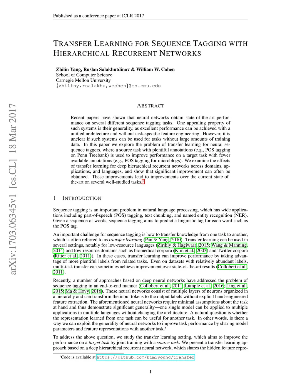 Transfer Learning for Sequence Tagging with Hierarchical Recurrent