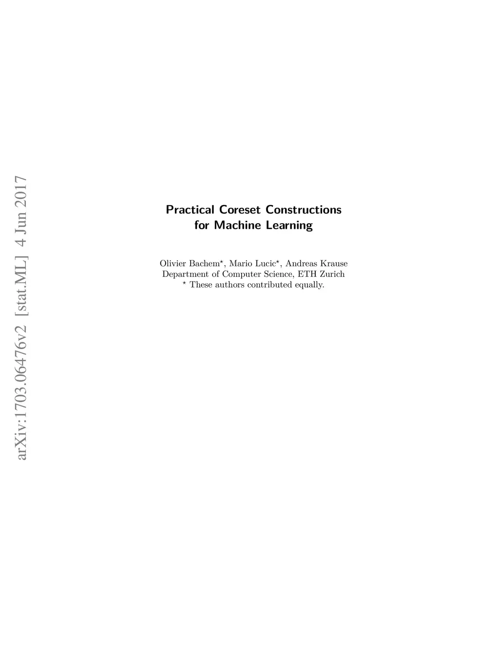 We investigate coresets - succinct, small summaries of large data sets - so that solutions found on the summary are provably competitive with solution found on the full data set. We provide an overview over the state-of-the-art in coreset construction for machine learning. In Section 2, we present both the intuition behind and a theoretically sound framework to construct coresets for general problems and apply it to -means clustering. In Section 3 we summarize existing coreset construction algorithms for a variety of machine learning problems such as maximum likelihood estimation of mixture models, Bayesian non-parametric models, principal component analysis, regression and general empirical risk minimization.