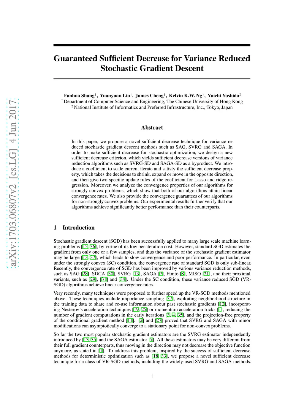In this paper, we propose a novel sufficient decrease technique for variance reduced stochastic gradient descent methods such as SAG, SVRG and SAGA. In order to make sufficient decrease for stochastic optimization, we design a new sufficient decrease criterion, which yields sufficient decrease versions of variance reduction algorithms such as SVRG-SD and SAGA-SD as a byproduct. We introduce a coefficient to scale current iterate and satisfy the sufficient decrease property, which takes the decisions to shrink, expand or move in the opposite direction, and then give two specific update rules of the coefficient for Lasso and ridge regression. Moreover, we analyze the convergence properties of our algorithms for strongly convex problems, which show that both of our algorithms attain linear convergence rates. We also provide the convergence guarantees of our algorithms for non-strongly convex problems. Our experimental results further verify that our algorithms achieve significantly better performance than their counterparts.