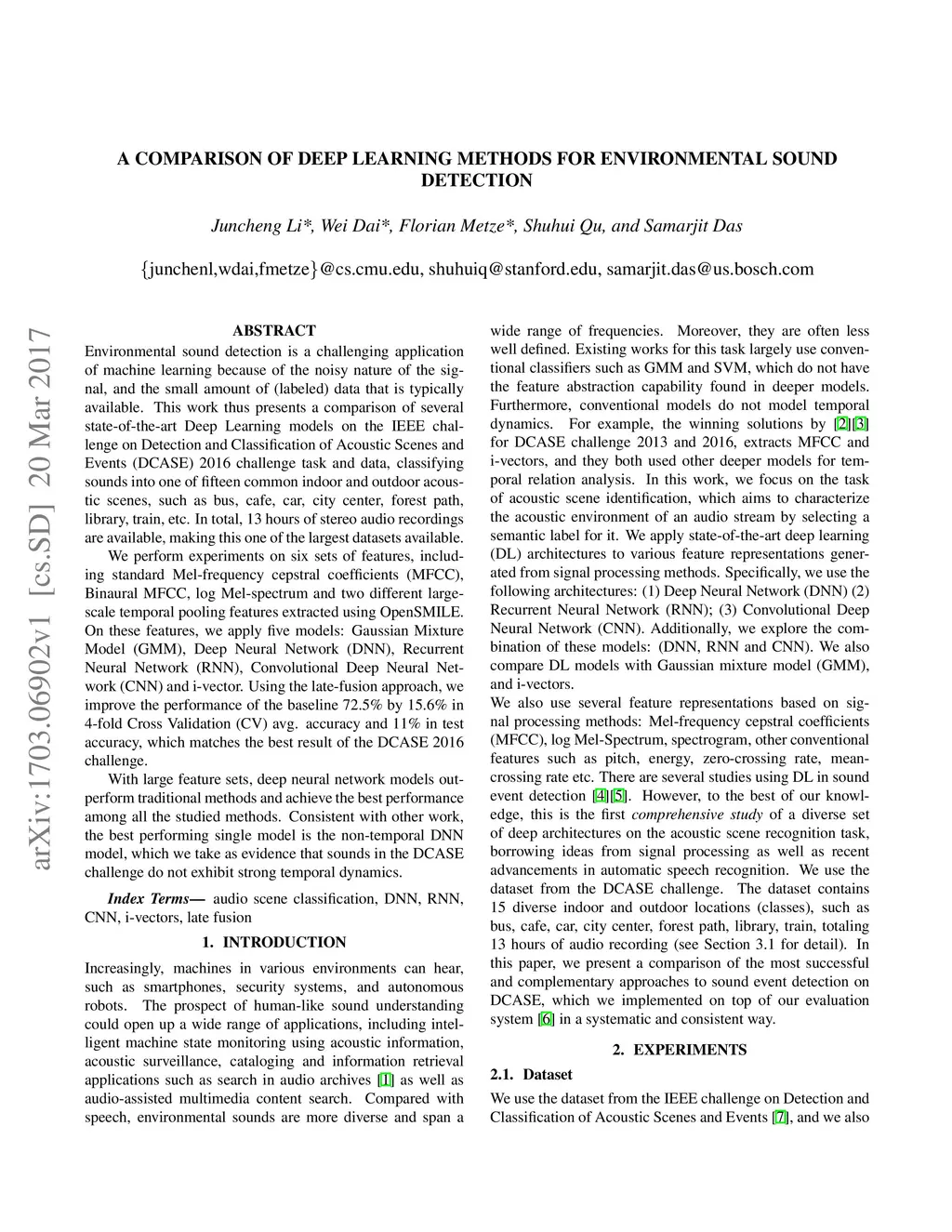 Environmental sound detection is a challenging application of machine learning because of the noisy nature of the signal, and the small amount of (labeled) data that is typically available. This work thus presents a comparison of several state-of-the-art Deep Learning models on the IEEE challenge on Detection and Classification of Acoustic Scenes and Events (DCASE) 2016 challenge task and data, classifying sounds into one of fifteen common indoor and outdoor acoustic scenes, such as bus, cafe, car, city center, forest path, library, train, etc. In total, 13 hours of stereo audio recordings are available, making this one of the largest datasets available. We perform experiments on six sets of features, including standard Mel-frequency cepstral coefficients (MFCC), Binaural MFCC, log Mel-spectrum and two different large- scale temporal pooling features extracted using OpenSMILE. On these features, we apply five models: Gaussian Mixture Model (GMM), Deep Neural Network (DNN), Recurrent Neural Network (RNN), Convolutional Deep Neural Net- work (CNN) and i-vector. Using the late-fusion approach, we improve the performance of the baseline 72.5% by 15.6% in 4-fold Cross Validation (CV) avg. accuracy and 11% in test accuracy, which matches the best result of the DCASE 2016 challenge. With large feature sets, deep neural network models out- perform traditional methods and achieve the best performance among all the studied methods. Consistent with other work, the best performing single model is the non-temporal DNN model, which we take as evidence that sounds in the DCASE challenge do not exhibit strong temporal dynamics.