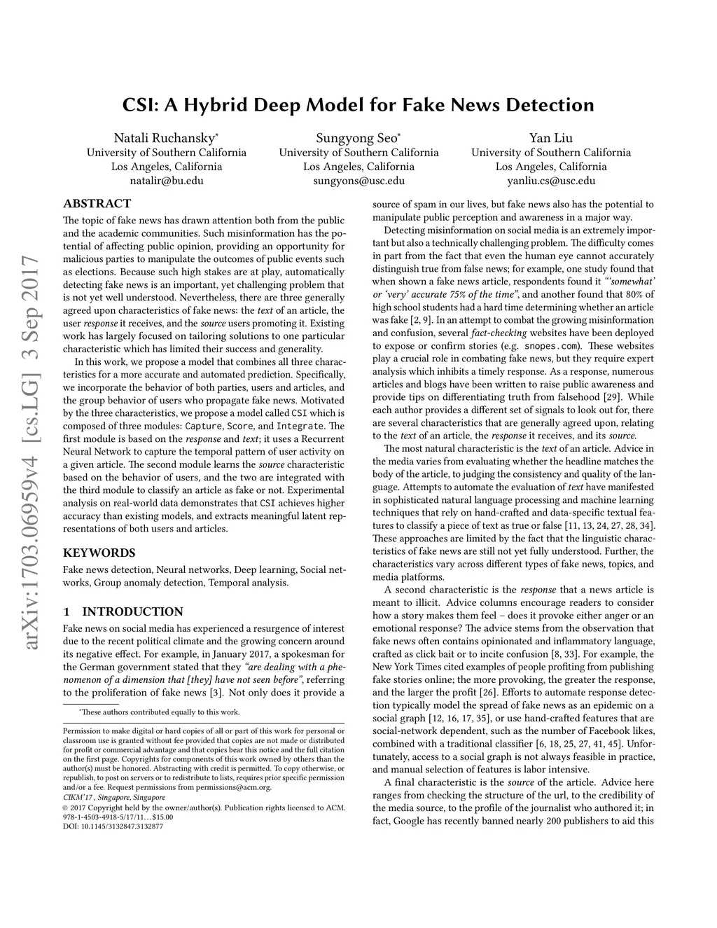 CSI: A Hybrid Deep Model for Fake News Detection