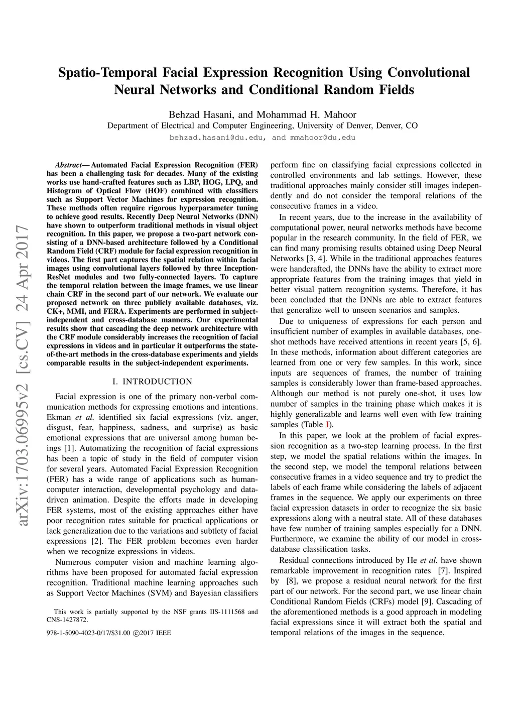 Automated Facial Expression Recognition (FER) has been a challenging task for decades. Many of the existing works use hand-crafted features such as LBP, HOG, LPQ, and Histogram of Optical Flow (HOF) combined with classifiers such as Support Vector Machines for expression recognition. These methods often require rigorous hyperparameter tuning to achieve good results. Recently Deep Neural Networks (DNN) have shown to outperform traditional methods in visual object recognition. In this paper, we propose a two-part network consisting of a DNN-based architecture followed by a Conditional Random Field (CRF) module for facial expression recognition in videos. The first part captures the spatial relation within facial images using convolutional layers followed by three Inception-ResNet modules and two fully-connected layers. To capture the temporal relation between the image frames, we use linear chain CRF in the second part of our network. We evaluate our proposed network on three publicly available databases, viz. CK+, MMI, and FERA. Experiments are performed in subject-independent and cross-database manners. Our experimental results show that cascading the deep network architecture with the CRF module considerably increases the recognition of facial expressions in videos and in particular it outperforms the state-of-the-art methods in the cross-database experiments and yields comparable results in the subject-independent experiments.