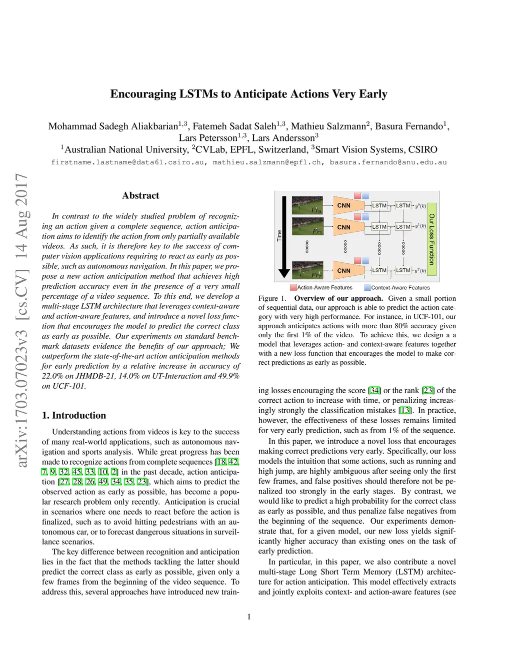 In contrast to the widely studied problem of recognizing an action given a complete sequence, action anticipation aims to identify the action from only partially available videos. As such, it is therefore key to the success of computer vision applications requiring to react as early as possible, such as autonomous navigation. In this paper, we propose a new action anticipation method that achieves high prediction accuracy even in the presence of a very small percentage of a video sequence. To this end, we develop a multi-stage LSTM architecture that leverages context-aware and action-aware features, and introduce a novel loss function that encourages the model to predict the correct class as early as possible. Our experiments on standard benchmark datasets evidence the benefits of our approach; We outperform the state-of-the-art action anticipation methods for early prediction by a relative increase in accuracy of 22.0% on JHMDB-21, 14.0% on UT-Interaction and 49.9% on UCF-101.