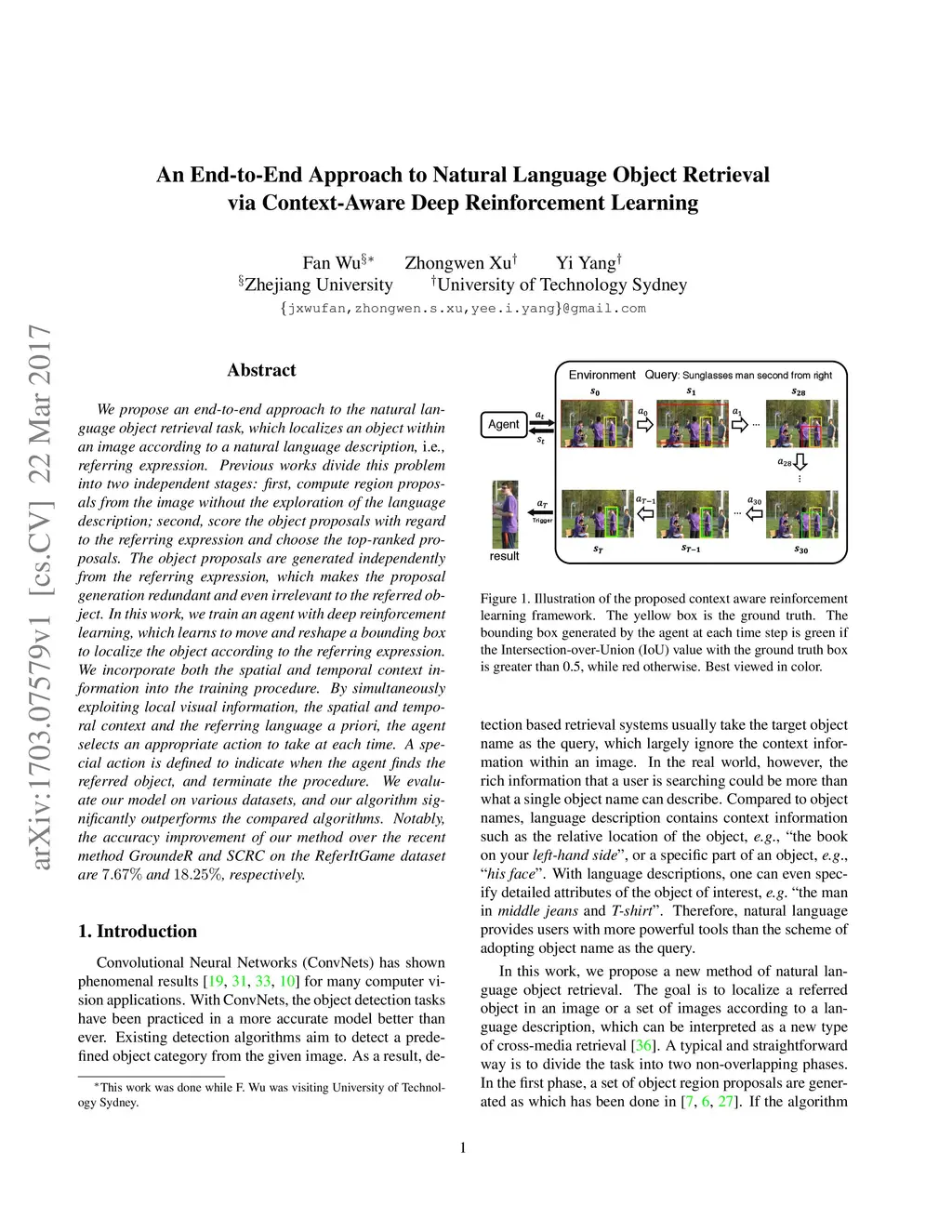 We propose an end-to-end approach to the natural language object retrieval task, which localizes an object within an image according to a natural language description, i.e., referring expression. Previous works divide this problem into two independent stages: first, compute region proposals from the image without the exploration of the language description; second, score the object proposals with regard to the referring expression and choose the top-ranked proposals. The object proposals are generated independently from the referring expression, which makes the proposal generation redundant and even irrelevant to the referred object. In this work, we train an agent with deep reinforcement learning, which learns to move and reshape a bounding box to localize the object according to the referring expression. We incorporate both the spatial and temporal context information into the training procedure. By simultaneously exploiting local visual information, the spatial and temporal context and the referring language a priori, the agent selects an appropriate action to take at each time. A special action is defined to indicate when the agent finds the referred object, and terminate the procedure. We evaluate our model on various datasets, and our algorithm significantly outperforms the compared algorithms. Notably, the accuracy improvement of our method over the recent method GroundeR and SCRC on the ReferItGame dataset are 7.67% and 18.25%, respectively.