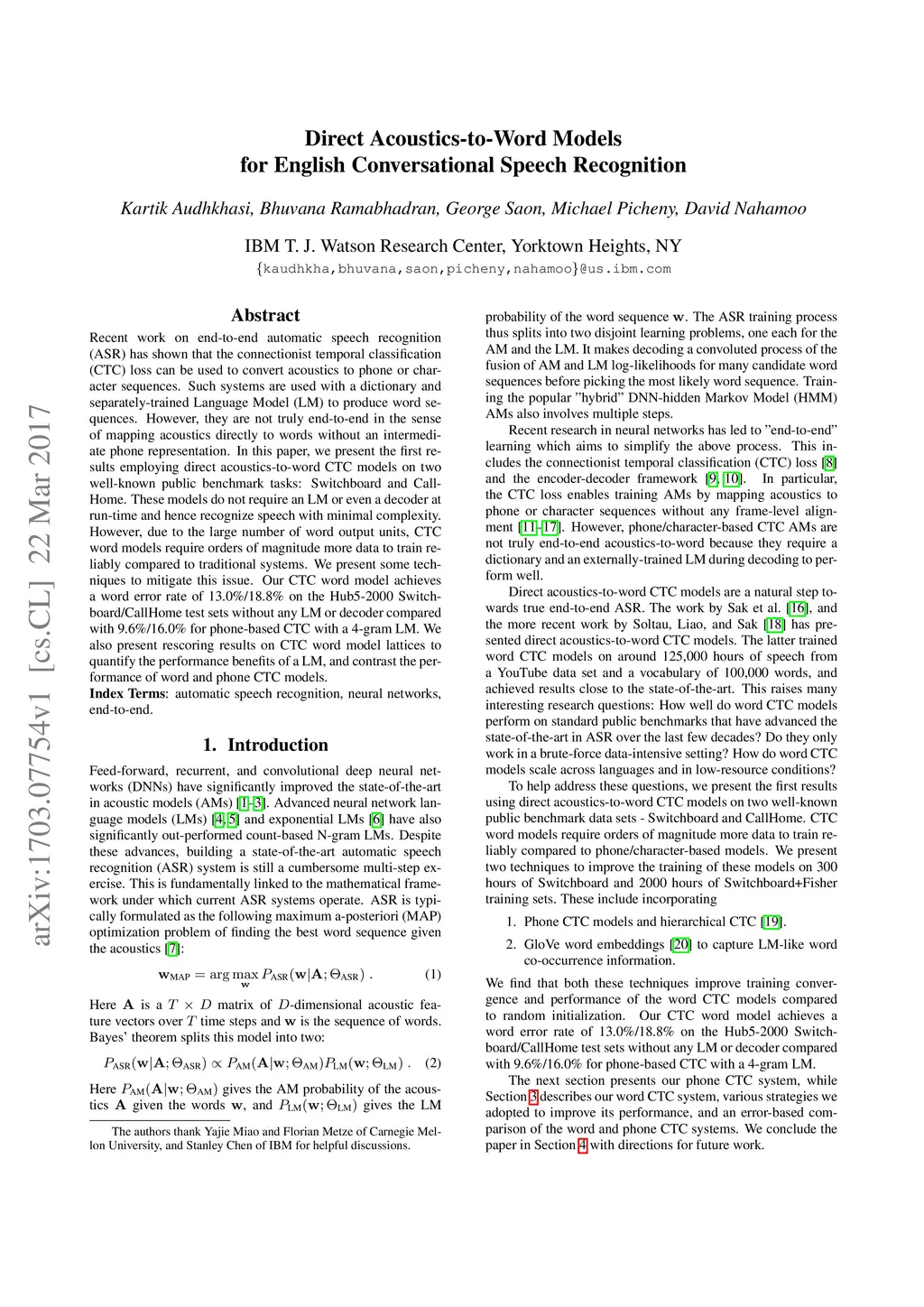 Direct Acoustics-to-Word Models for English Conversational Speech