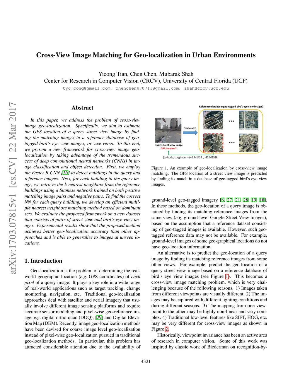 Cross-View Image Matching for Geo-localization in Urban Environments
