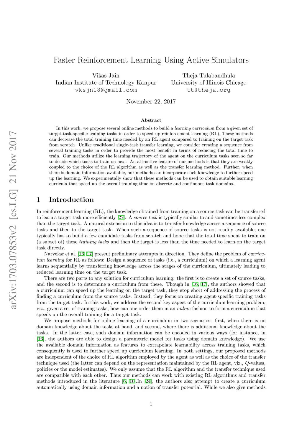 Faster Reinforcement Learning Using Active Simulators