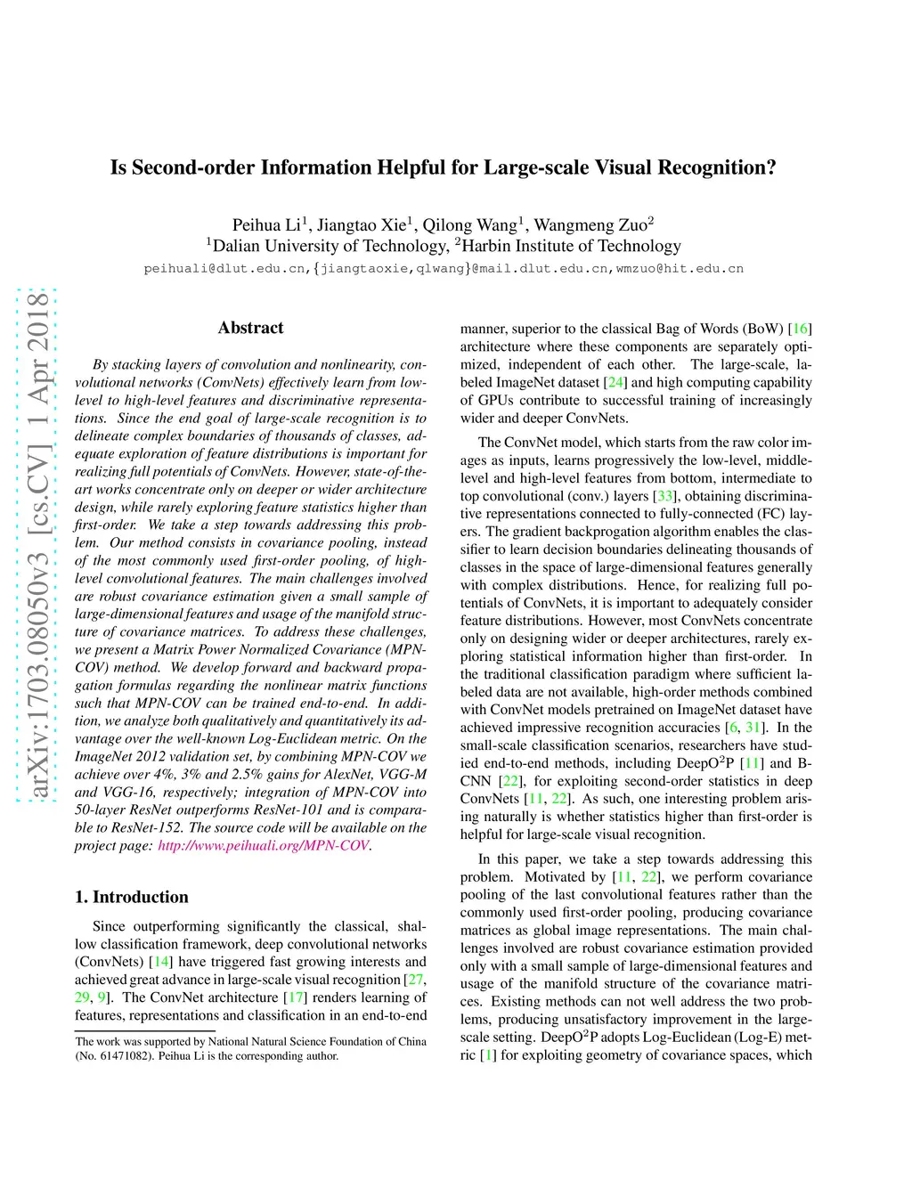 By stacking layers of convolution and nonlinearity, convolutional networks (ConvNets) effectively learn from low-level to high-level features and discriminative representations. Since the end goal of large-scale recognition is to delineate complex boundaries of thousands of classes, adequate exploration of feature distributions is important for realizing full potentials of ConvNets. However, state-of-the-art works concentrate only on deeper or wider architecture design, while rarely exploring feature statistics higher than first-order. We take a step towards addressing this problem. Our method consists in covariance pooling, instead of the most commonly used first-order pooling, of high-level convolutional features. The main challenges involved are robust covariance estimation given a small sample of large-dimensional features and usage of the manifold structure of covariance matrices. To address these challenges, we present a Matrix Power Normalized Covariance (MPN-COV) method. We develop forward and backward propagation formulas regarding the nonlinear matrix functions such that MPN-COV can be trained end-to-end. In addition, we analyze both qualitatively and quantitatively its advantage over the well-known Log-Euclidean metric. On the ImageNet 2012 validation set, by combining MPN-COV we achieve over 4%, 3% and 2.5% gains for AlexNet, VGG-M and VGG-16, respectively; integration of MPN-COV into 50-layer ResNet outperforms ResNet-101 and is comparable to ResNet-152. The source code will be available on the project page: http://www.peihuali.org/MPN-COV.