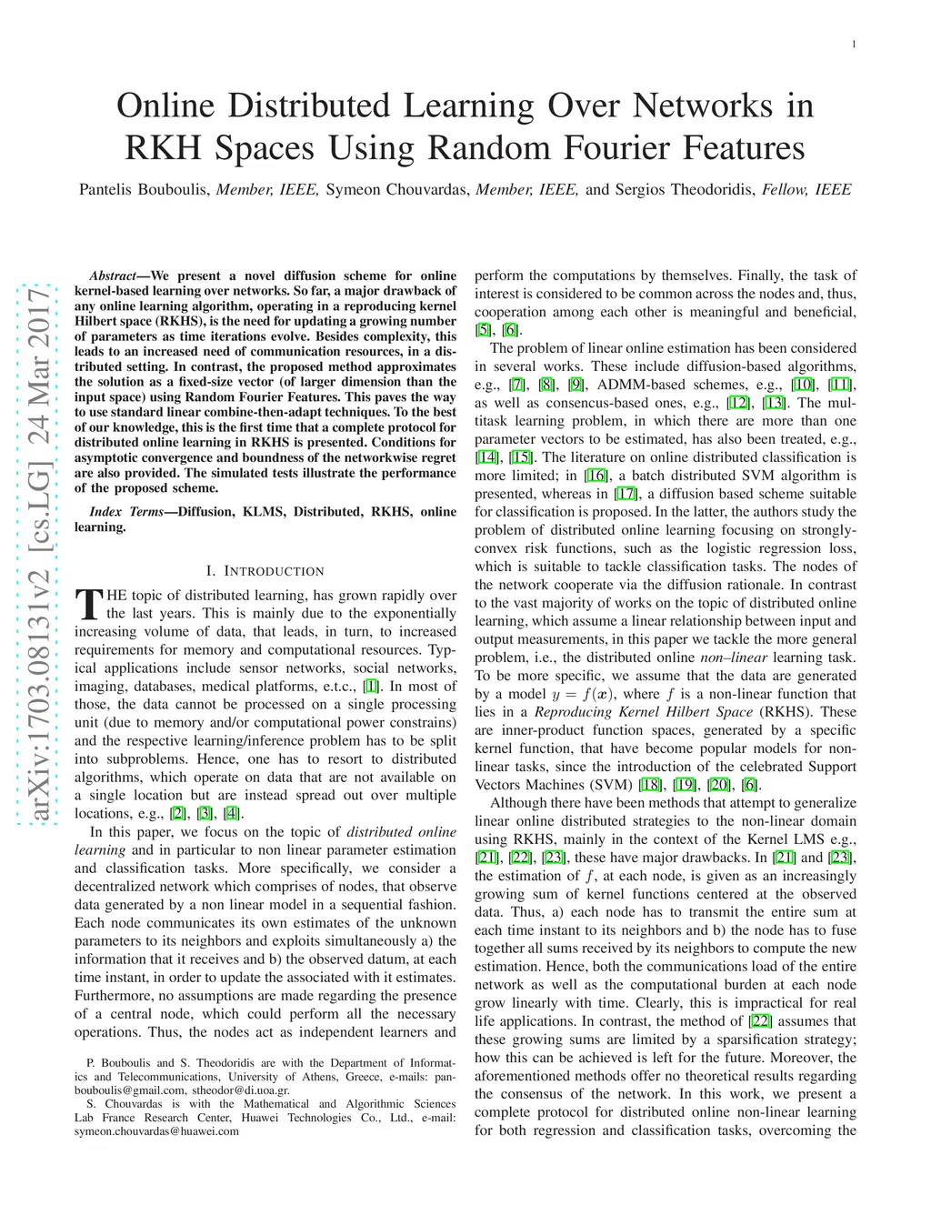 We present a novel diffusion scheme for online kernel-based learning over networks. So far, a major drawback of any online learning algorithm, operating in a reproducing kernel Hilbert space (RKHS), is the need for updating a growing number of parameters as time iterations evolve. Besides complexity, this leads to an increased need of communication resources, in a distributed setting. In contrast, the proposed method approximates the solution as a fixed-size vector (of larger dimension than the input space) using Random Fourier Features. This paves the way to use standard linear combine-then-adapt techniques. To the best of our knowledge, this is the first time that a complete protocol for distributed online learning in RKHS is presented. Conditions for asymptotic convergence and boundness of the networkwise regret are also provided. The simulated tests illustrate the performance of the proposed scheme.