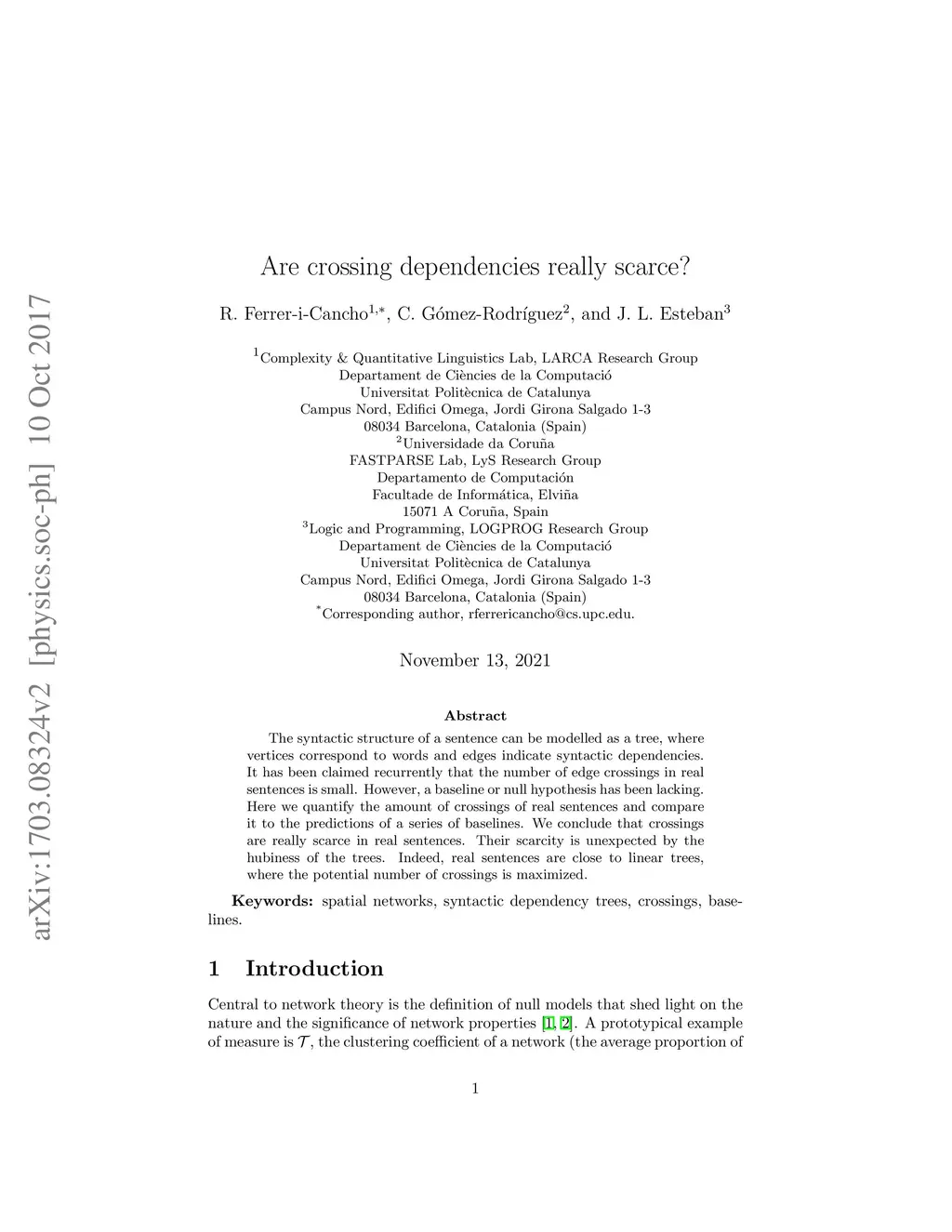 The syntactic structure of a sentence can be modelled as a tree, where vertices correspond to words and edges indicate syntactic dependencies. It has been claimed recurrently that the number of edge crossings in real sentences is small. However, a baseline or null hypothesis has been lacking. Here we quantify the amount of crossings of real sentences and compare it to the predictions of a series of baselines. We conclude that crossings are really scarce in real sentences. Their scarcity is unexpected by the hubiness of the trees. Indeed, real sentences are close to linear trees, where the potential number of crossings is maximized.