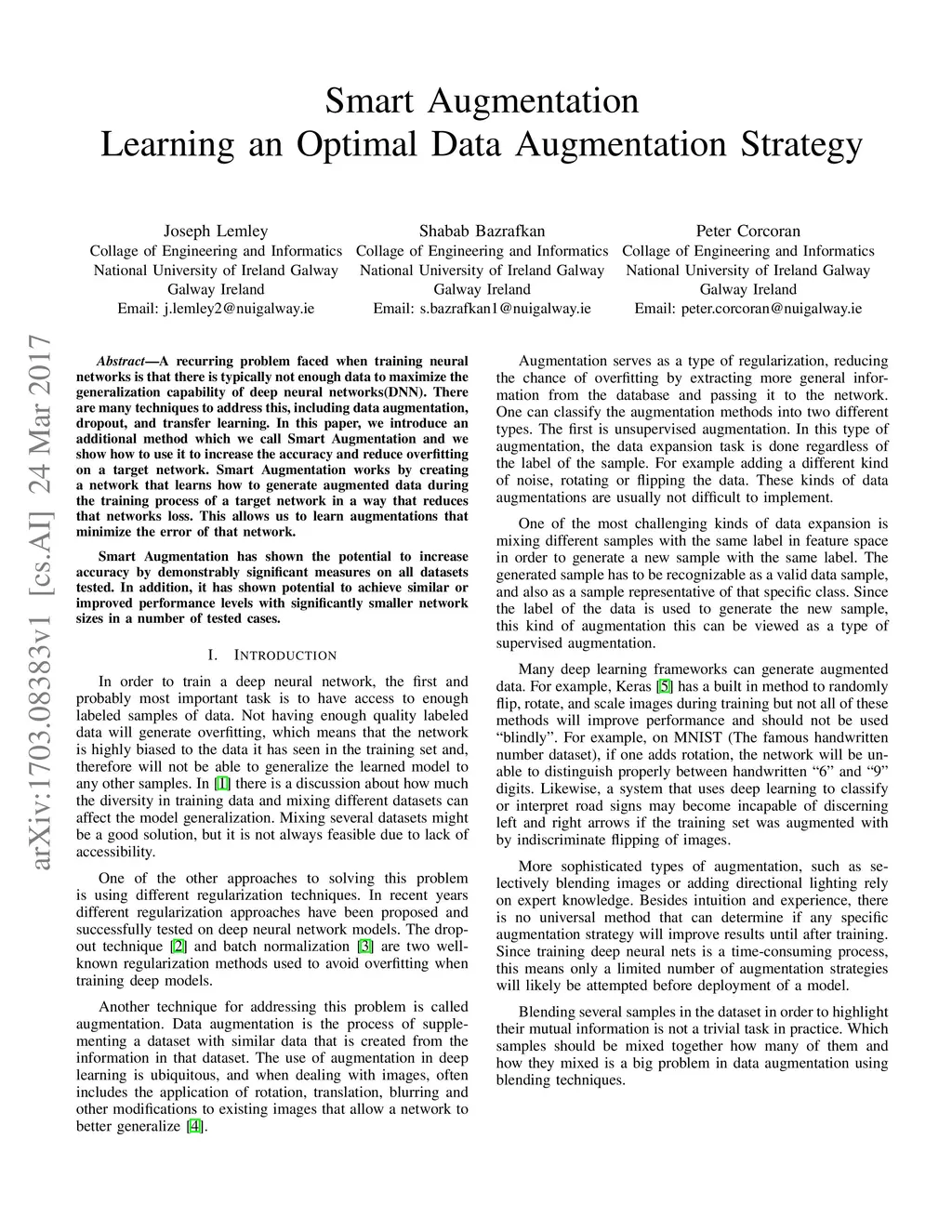 A recurring problem faced when training neural networks is that there is typically not enough data to maximize the generalization capability of deep neural networks(DNN). There are many techniques to address this, including data augmentation, dropout, and transfer learning. In this paper, we introduce an additional method which we call Smart Augmentation and we show how to use it to increase the accuracy and reduce overfitting on a target network. Smart Augmentation works by creating a network that learns how to generate augmented data during the training process of a target network in a way that reduces that networks loss. This allows us to learn augmentations that minimize the error of that network. Smart Augmentation has shown the potential to increase accuracy by demonstrably significant measures on all datasets tested. In addition, it has shown potential to achieve similar or improved performance levels with significantly smaller network sizes in a number of tested cases.