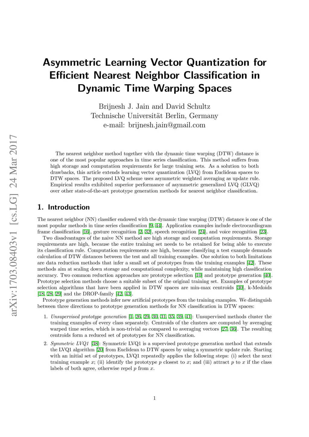 The nearest neighbor method together with the dynamic time warping (DTW) distance is one of the most popular approaches in time series classification. This method suffers from high storage and computation requirements for large training sets. As a solution to both drawbacks, this article extends learning vector quantization (LVQ) from Euclidean spaces to DTW spaces. The proposed LVQ scheme uses asymmetric weighted averaging as update rule. Empirical results exhibited superior performance of asymmetric generalized LVQ (GLVQ) over other state-of-the-art prototype generation methods for nearest neighbor classification.