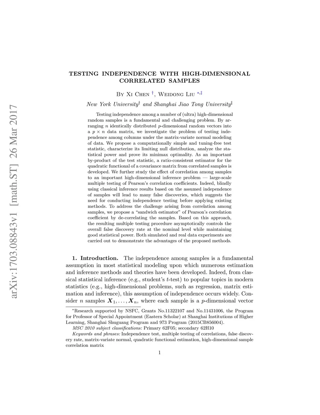 Testing independence among a number of (ultra) high-dimensional random samples is a fundamental and challenging problem. By arranging identically distributed -dimensional random vectors into a data matrix, we investigate the problem of testing independence among columns under the matrix-variate normal modeling of data. We propose a computationally simple and tuning-free test statistic, characterize its limiting null distribution, analyze the statistical power and prove its minimax optimality. As an important by-product of the test statistic, a ratio-consistent estimator for the quadratic functional of a covariance matrix from correlated samples is developed. We further study the effect of correlation among samples to an important high-dimensional inference problem --- large-scale multiple testing of Pearson's correlation coefficients. Indeed, blindly using classical inference results based on the assumed independence of samples will lead to many false discoveries, which suggests the need for conducting independence testing before applying existing methods. To address the challenge arising from correlation among samples, we propose a "sandwich estimator" of Pearson's correlation coefficient by de-correlating the samples. Based on this approach, the resulting multiple testing procedure asymptotically controls the overall false discovery rate at the nominal level while maintaining good statistical power. Both simulated and real data experiments are carried out to demonstrate the advantages of the proposed methods.