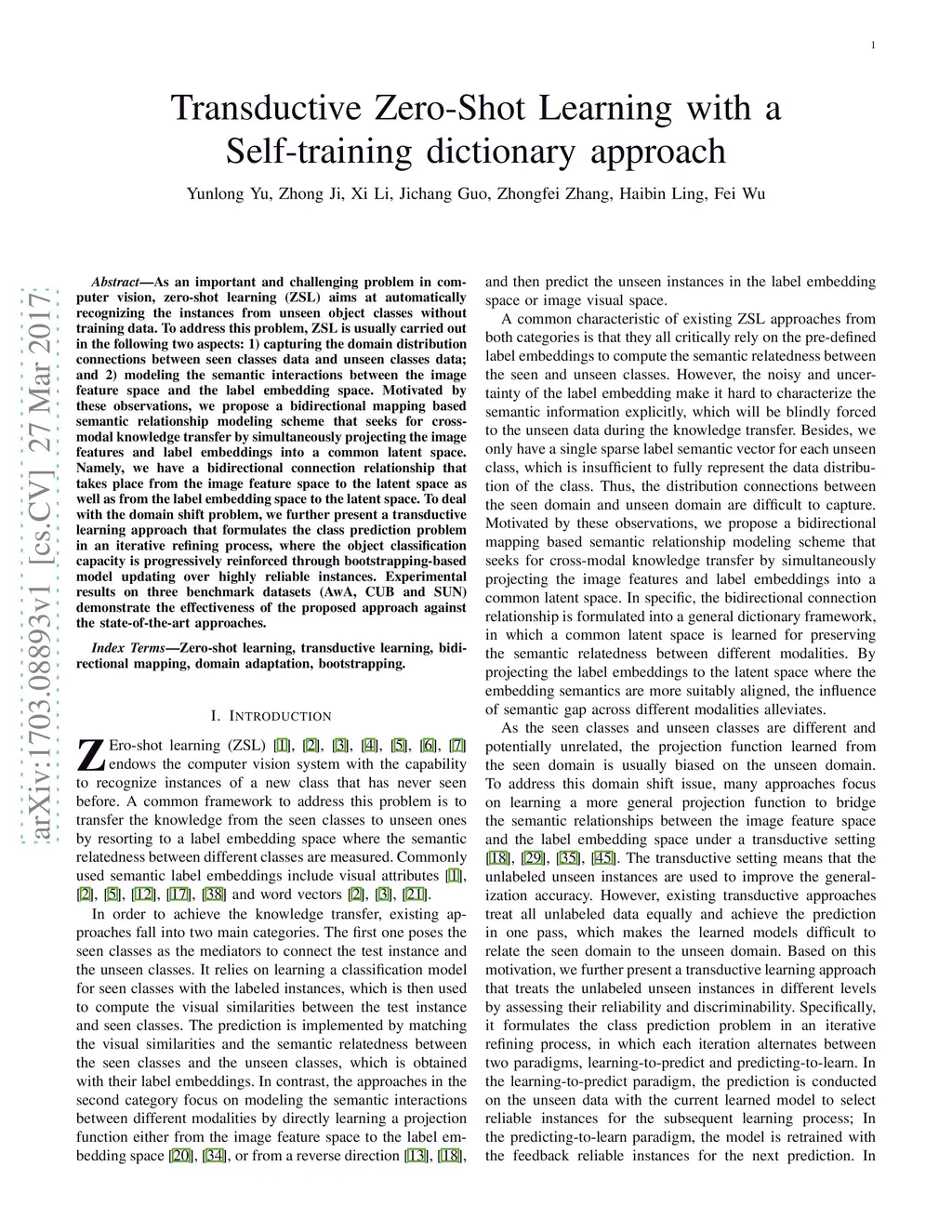 Transductive Zero-Shot Learning with a Self-training dictionary approach