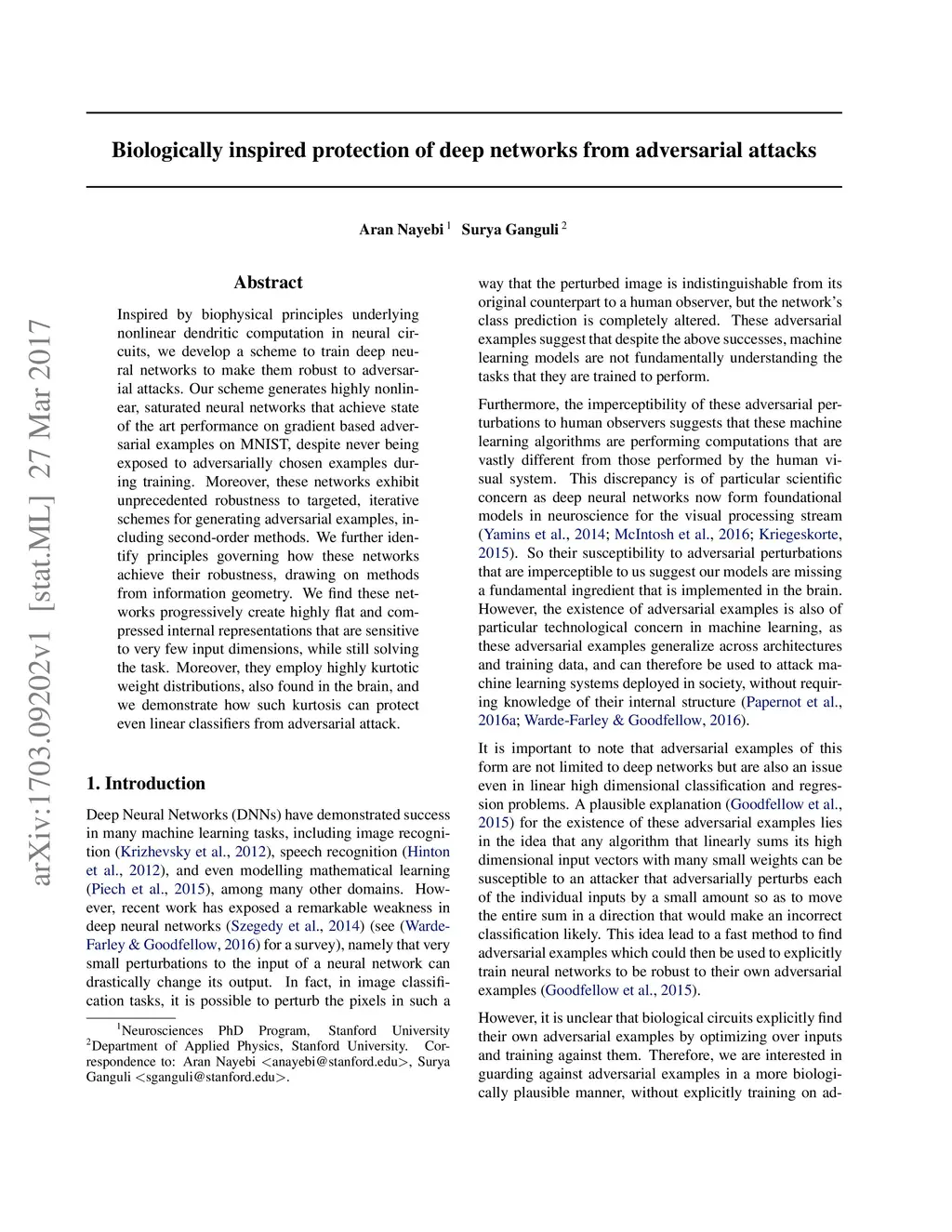 Biologically inspired protection of deep networks from adversarial