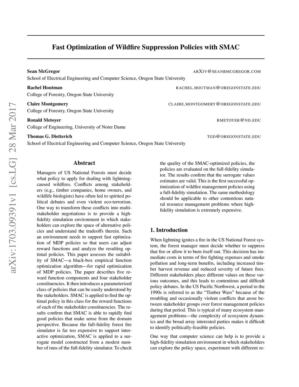 Managers of US National Forests must decide what policy to apply for dealing with lightning-caused wildfires. Conflicts among stakeholders (e.g., timber companies, home owners, and wildlife biologists) have often led to spirited political debates and even violent eco-terrorism. One way to transform these conflicts into multi-stakeholder negotiations is to provide a high-fidelity simulation environment in which stakeholders can explore the space of alternative policies and understand the tradeoffs therein. Such an environment needs to support fast optimization of MDP policies so that users can adjust reward functions and analyze the resulting optimal policies. This paper assesses the suitability of SMAC---a black-box empirical function optimization algorithm---for rapid optimization of MDP policies. The paper describes five reward function components and four stakeholder constituencies. It then introduces a parameterized class of policies that can be easily understood by the stakeholders. SMAC is applied to find the optimal policy in this class for the reward functions of each of the stakeholder constituencies. The results confirm that SMAC is able to rapidly find good policies that make sense from the domain perspective. Because the full-fidelity forest fire simulator is far too expensive to support interactive optimization, SMAC is applied to a surrogate model constructed from a modest number of runs of the full-fidelity simulator. To check the quality of the SMAC-optimized policies, the policies are evaluated on the full-fidelity simulator. The results confirm that the surrogate values estimates are valid. This is the first successful optimization of wildfire management policies using a full-fidelity simulation. The same methodology should be applicable to other contentious natural resource management problems where high-fidelity simulation is extremely expensive.