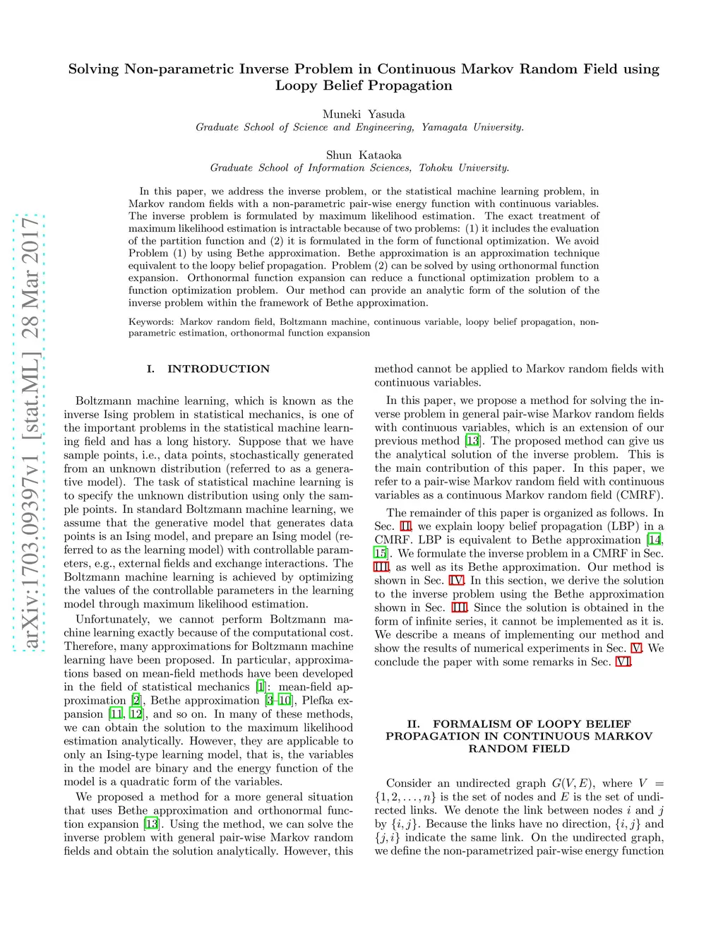 In this paper, we address the inverse problem, or the statistical machine learning problem, in Markov random fields with a non-parametric pair-wise energy function with continuous variables. The inverse problem is formulated by maximum likelihood estimation. The exact treatment of maximum likelihood estimation is intractable because of two problems: (1) it includes the evaluation of the partition function and (2) it is formulated in the form of functional optimization. We avoid Problem (1) by using Bethe approximation. Bethe approximation is an approximation technique equivalent to the loopy belief propagation. Problem (2) can be solved by using orthonormal function expansion. Orthonormal function expansion can reduce a functional optimization problem to a function optimization problem. Our method can provide an analytic form of the solution of the inverse problem within the framework of Bethe approximation.