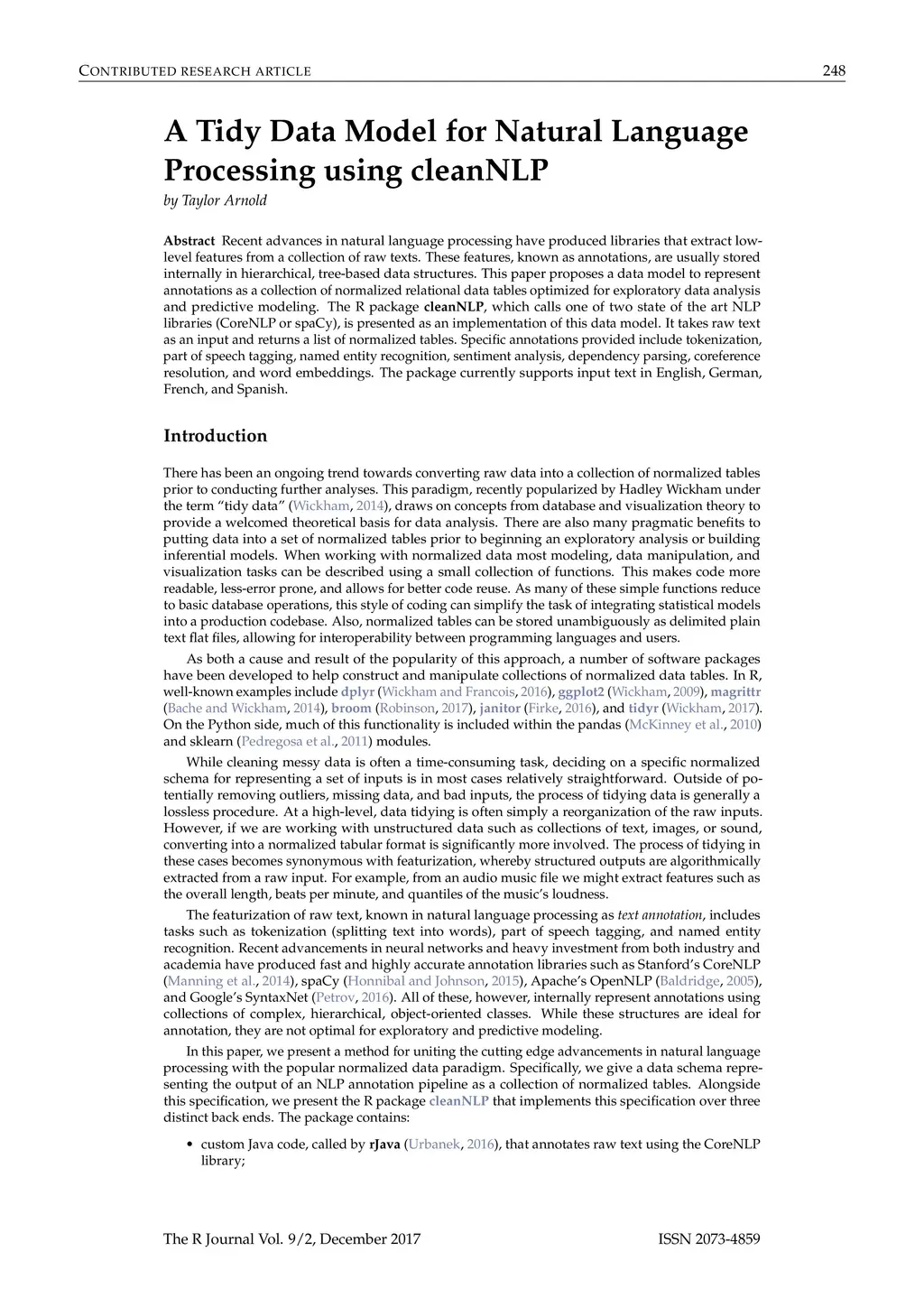 The package cleanNLP provides a set of fast tools for converting a textual corpus into a set of normalized tables. The underlying natural language processing pipeline utilizes Stanford's CoreNLP library, exposing a number of annotation tasks for text written in English, French, German, and Spanish. Annotators include tokenization, part of speech tagging, named entity recognition, entity linking, sentiment analysis, dependency parsing, coreference resolution, and information extraction.