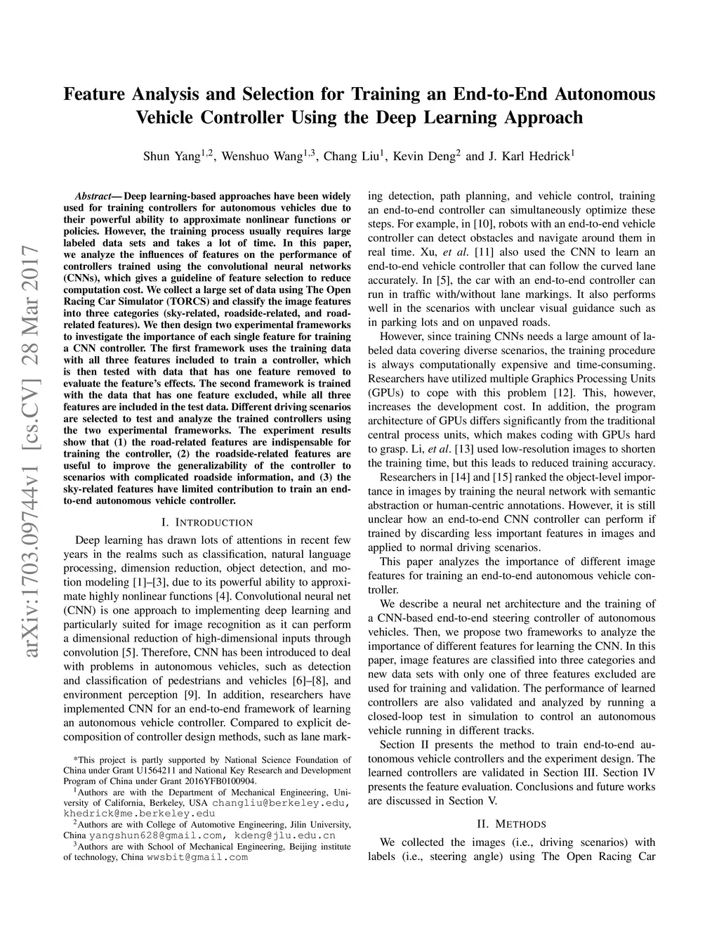 Deep learning-based approaches have been widely used for training controllers for autonomous vehicles due to their powerful ability to approximate nonlinear functions or policies. However, the training process usually requires large labeled data sets and takes a lot of time. In this paper, we analyze the influences of features on the performance of controllers trained using the convolutional neural networks (CNNs), which gives a guideline of feature selection to reduce computation cost. We collect a large set of data using The Open Racing Car Simulator (TORCS) and classify the image features into three categories (sky-related, roadside-related, and road-related features).We then design two experimental frameworks to investigate the importance of each single feature for training a CNN controller.The first framework uses the training data with all three features included to train a controller, which is then tested with data that has one feature removed to evaluate the feature's effects. The second framework is trained with the data that has one feature excluded, while all three features are included in the test data. Different driving scenarios are selected to test and analyze the trained controllers using the two experimental frameworks. The experiment results show that (1) the road-related features are indispensable for training the controller, (2) the roadside-related features are useful to improve the generalizability of the controller to scenarios with complicated roadside information, and (3) the sky-related features have limited contribution to train an end-to-end autonomous vehicle controller.