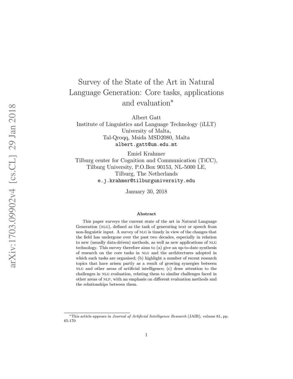 This paper surveys the current state of the art in Natural Language Generation (NLG), defined as the task of generating text or speech from non-linguistic input. A survey of NLG is timely in view of the changes that the field has undergone over the past decade or so, especially in relation to new (usually data-driven) methods, as well as new applications of NLG technology. This survey therefore aims to (a) give an up-to-date synthesis of research on the core tasks in NLG and the architectures adopted in which such tasks are organised; (b) highlight a number of relatively recent research topics that have arisen partly as a result of growing synergies between NLG and other areas of artificial intelligence; (c) draw attention to the challenges in NLG evaluation, relating them to similar challenges faced in other areas of Natural Language Processing, with an emphasis on different evaluation methods and the relationships between them.