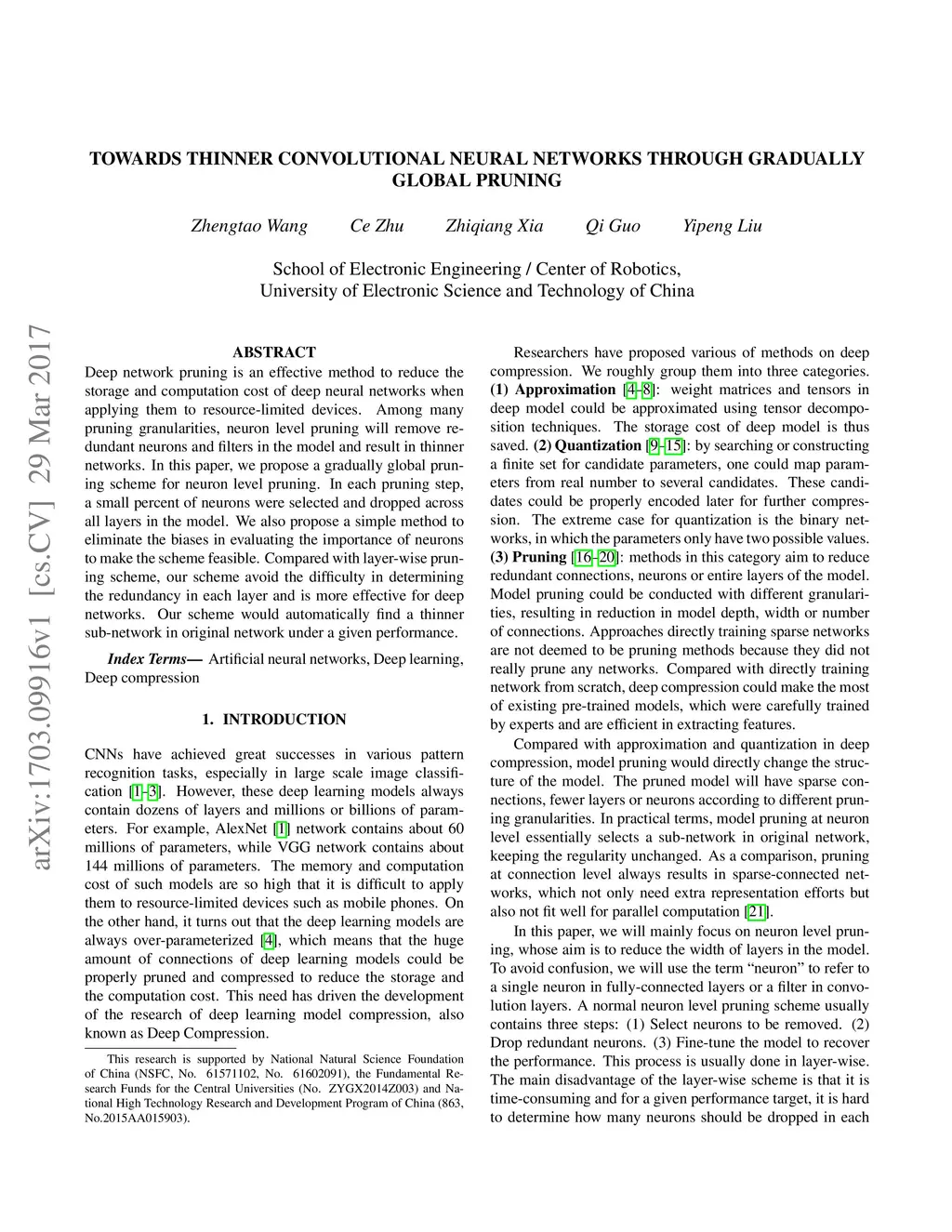 Deep network pruning is an effective method to reduce the storage and computation cost of deep neural networks when applying them to resource-limited devices. Among many pruning granularities, neuron level pruning will remove redundant neurons and filters in the model and result in thinner networks. In this paper, we propose a gradually global pruning scheme for neuron level pruning. In each pruning step, a small percent of neurons were selected and dropped across all layers in the model. We also propose a simple method to eliminate the biases in evaluating the importance of neurons to make the scheme feasible. Compared with layer-wise pruning scheme, our scheme avoid the difficulty in determining the redundancy in each layer and is more effective for deep networks. Our scheme would automatically find a thinner sub-network in original network under a given performance.