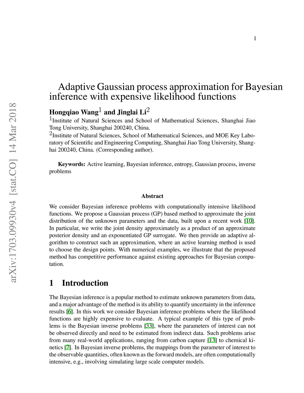 We consider Bayesian inference problems with computationally intensive likelihood functions. We propose a Gaussian process (GP) based method to approximate the joint distribution of the unknown parameters and the data. In particular, we write the joint density approximately as a product of an approximate posterior density and an exponentiated GP surrogate. We then provide an adaptive algorithm to construct such an approximation, where an active learning method is used to choose the design points. With numerical examples, we illustrate that the proposed method has competitive performance against existing approaches for Bayesian computation.