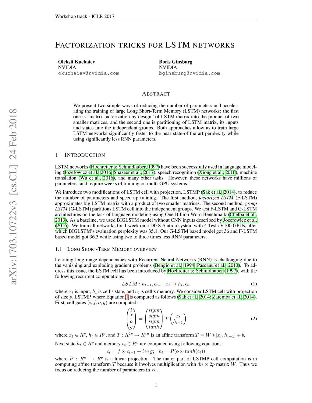 We present two simple ways of reducing the number of parameters and accelerating the training of large Long Short-Term Memory (LSTM) networks: the first one is "matrix factorization by design" of LSTM matrix into the product of two smaller matrices, and the second one is partitioning of LSTM matrix, its inputs and states into the independent groups. Both approaches allow us to train large LSTM networks significantly faster to the near state-of the art perplexity while using significantly less RNN parameters.