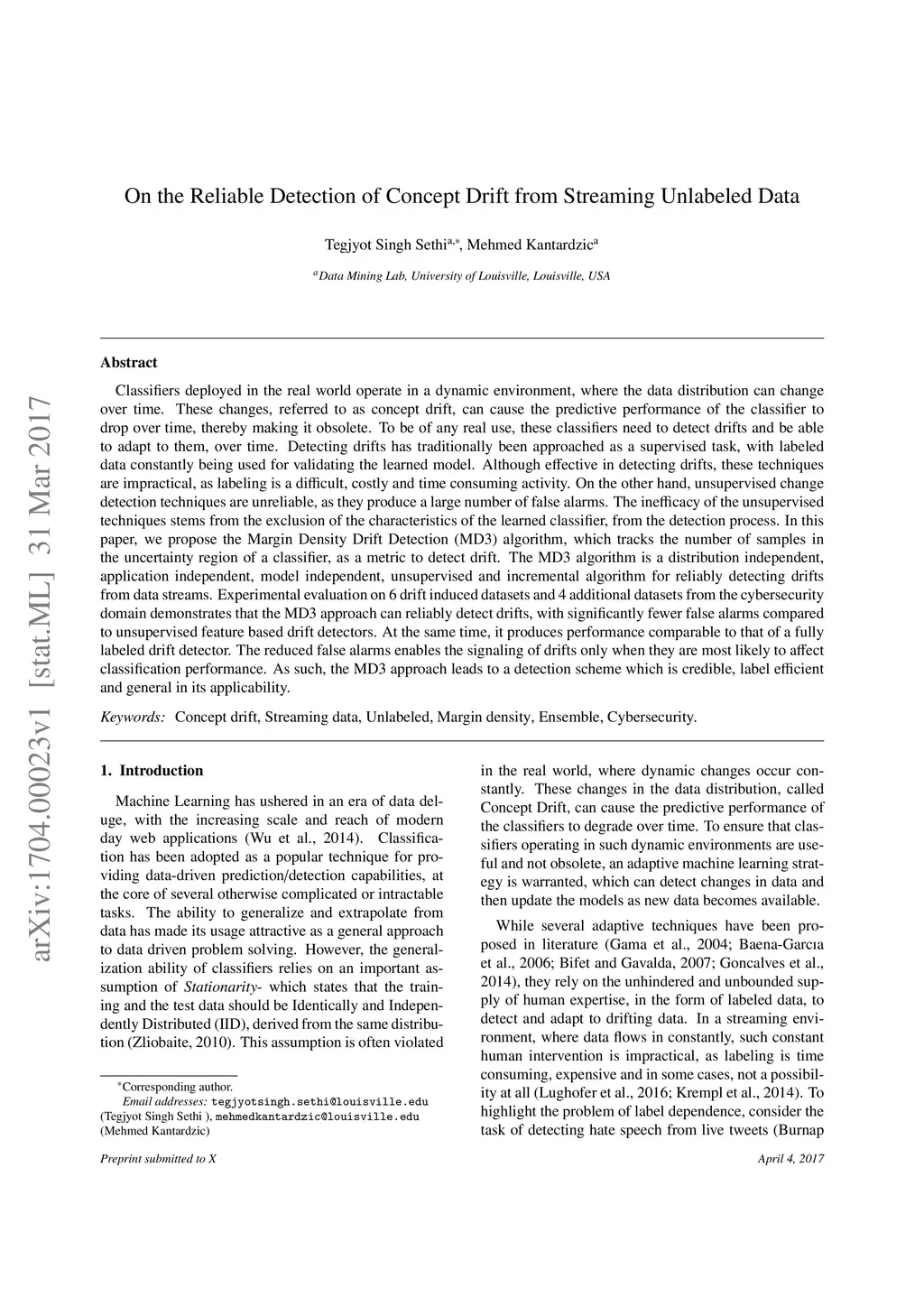 Classifiers deployed in the real world operate in a dynamic environment, where the data distribution can change over time. These changes, referred to as concept drift, can cause the predictive performance of the classifier to drop over time, thereby making it obsolete. To be of any real use, these classifiers need to detect drifts and be able to adapt to them, over time. Detecting drifts has traditionally been approached as a supervised task, with labeled data constantly being used for validating the learned model. Although effective in detecting drifts, these techniques are impractical, as labeling is a difficult, costly and time consuming activity. On the other hand, unsupervised change detection techniques are unreliable, as they produce a large number of false alarms. The inefficacy of the unsupervised techniques stems from the exclusion of the characteristics of the learned classifier, from the detection process. In this paper, we propose the Margin Density Drift Detection (MD3) algorithm, which tracks the number of samples in the uncertainty region of a classifier, as a metric to detect drift. The MD3 algorithm is a distribution independent, application independent, model independent, unsupervised and incremental algorithm for reliably detecting drifts from data streams. Experimental evaluation on 6 drift induced datasets and 4 additional datasets from the cybersecurity domain demonstrates that the MD3 approach can reliably detect drifts, with significantly fewer false alarms compared to unsupervised feature based drift detectors. The reduced false alarms enables the signaling of drifts only when they are most likely to affect classification performance. As such, the MD3 approach leads to a detection scheme which is credible, label efficient and general in its applicability.