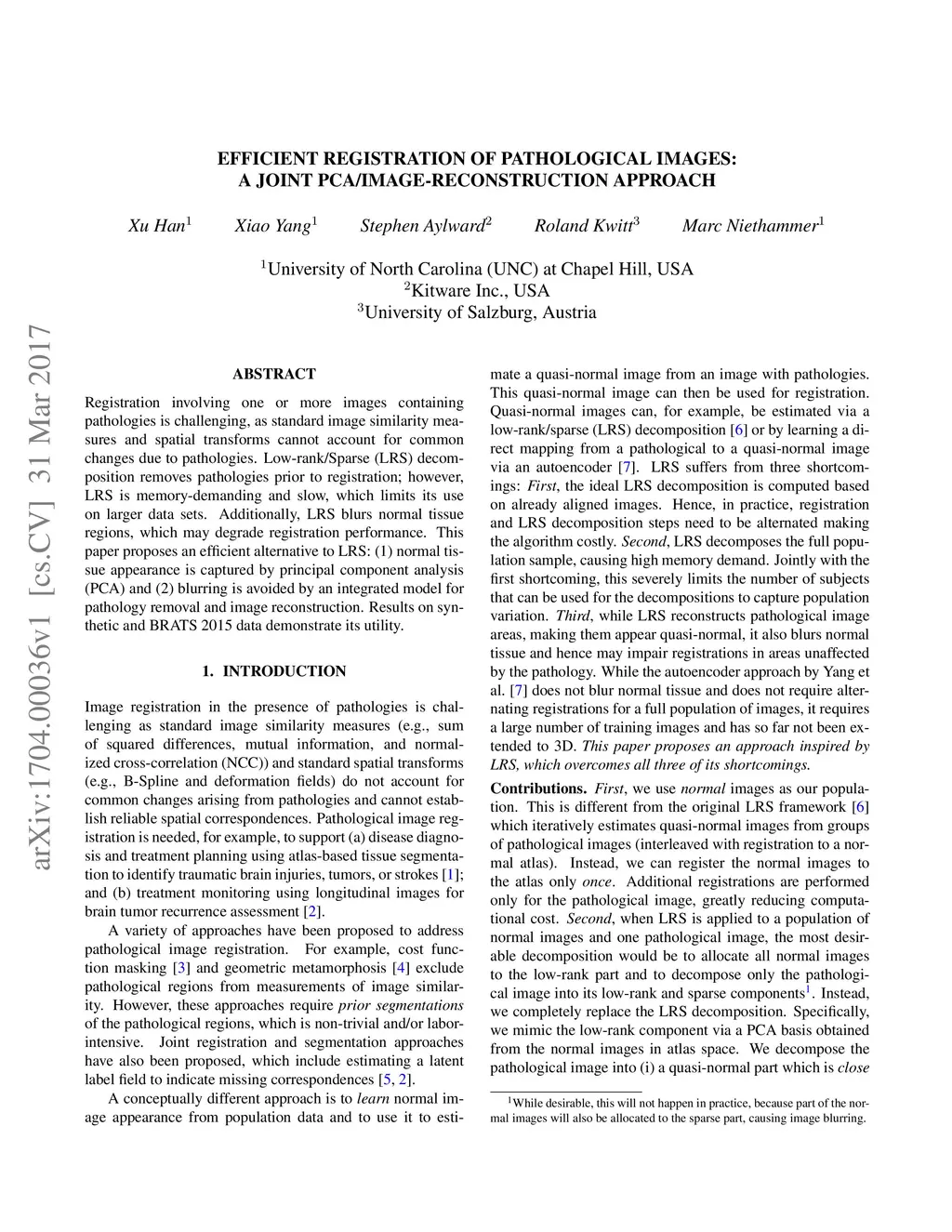 Registration involving one or more images containing pathologies is challenging, as standard image similarity measures and spatial transforms cannot account for common changes due to pathologies. Low-rank/Sparse (LRS) decomposition removes pathologies prior to registration; however, LRS is memory-demanding and slow, which limits its use on larger data sets. Additionally, LRS blurs normal tissue regions, which may degrade registration performance. This paper proposes an efficient alternative to LRS: (1) normal tissue appearance is captured by principal component analysis (PCA) and (2) blurring is avoided by an integrated model for pathology removal and image reconstruction. Results on synthetic and BRATS 2015 data demonstrate its utility.